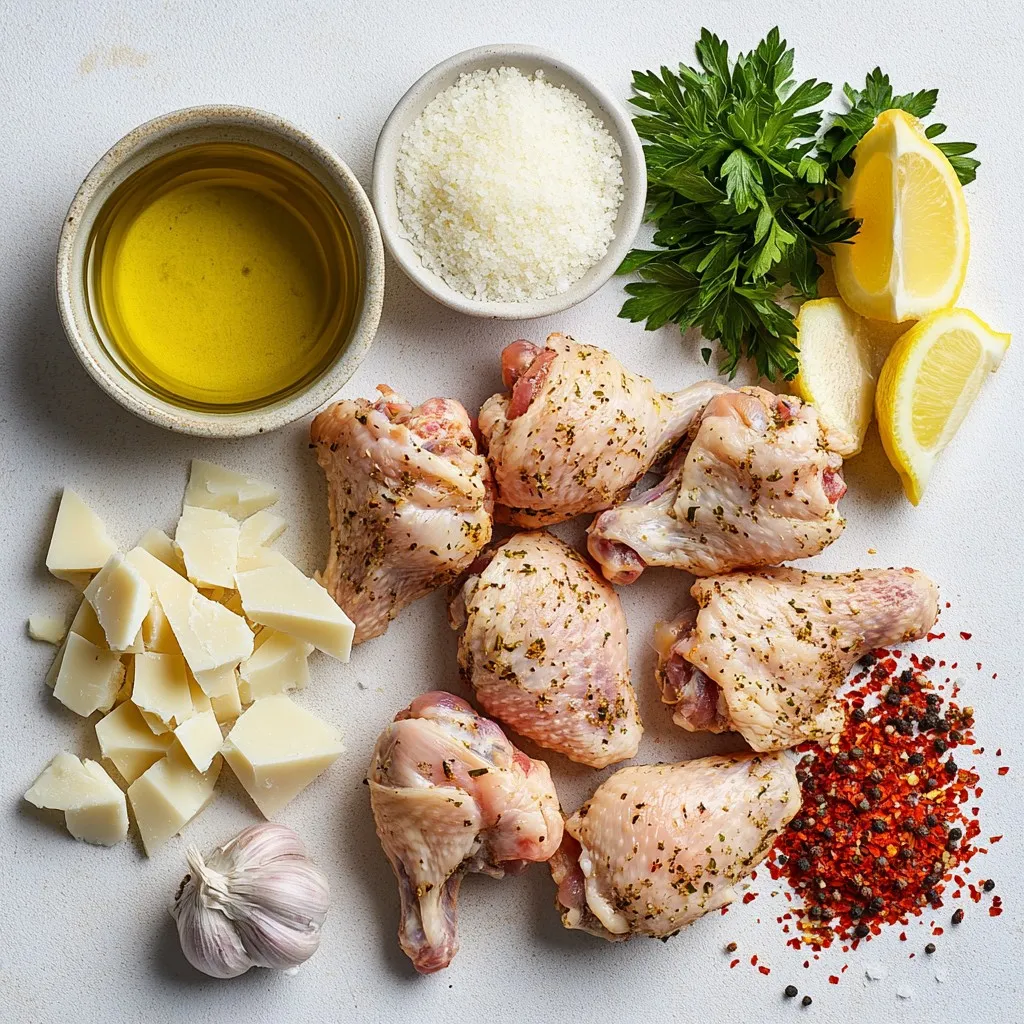 When picking chicken wings, look for fresh, plump options. Choose wings that are firm and have no signs of freezer burn. Fresh garlic adds a strong flavor, so select bulbs that feel heavy and firm. For olive oil, extra virgin is best for rich taste. Go for a brand you trust. When choosing Parmesan cheese, opt for block cheese and grate it yourself for the best flavor.
