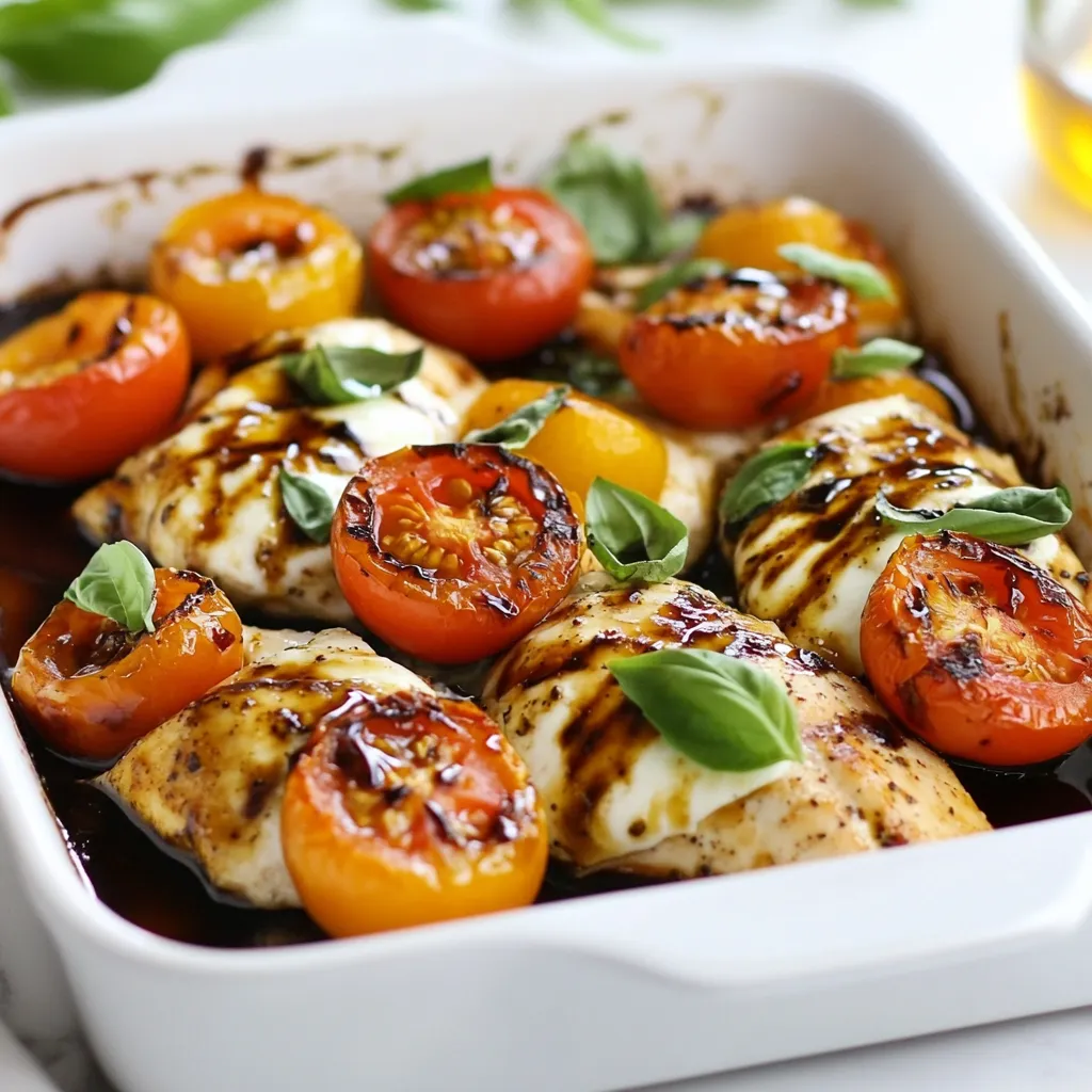 A delicious baked chicken dish topped with fresh mozzarella, cherry tomatoes, and a balsamic glaze.