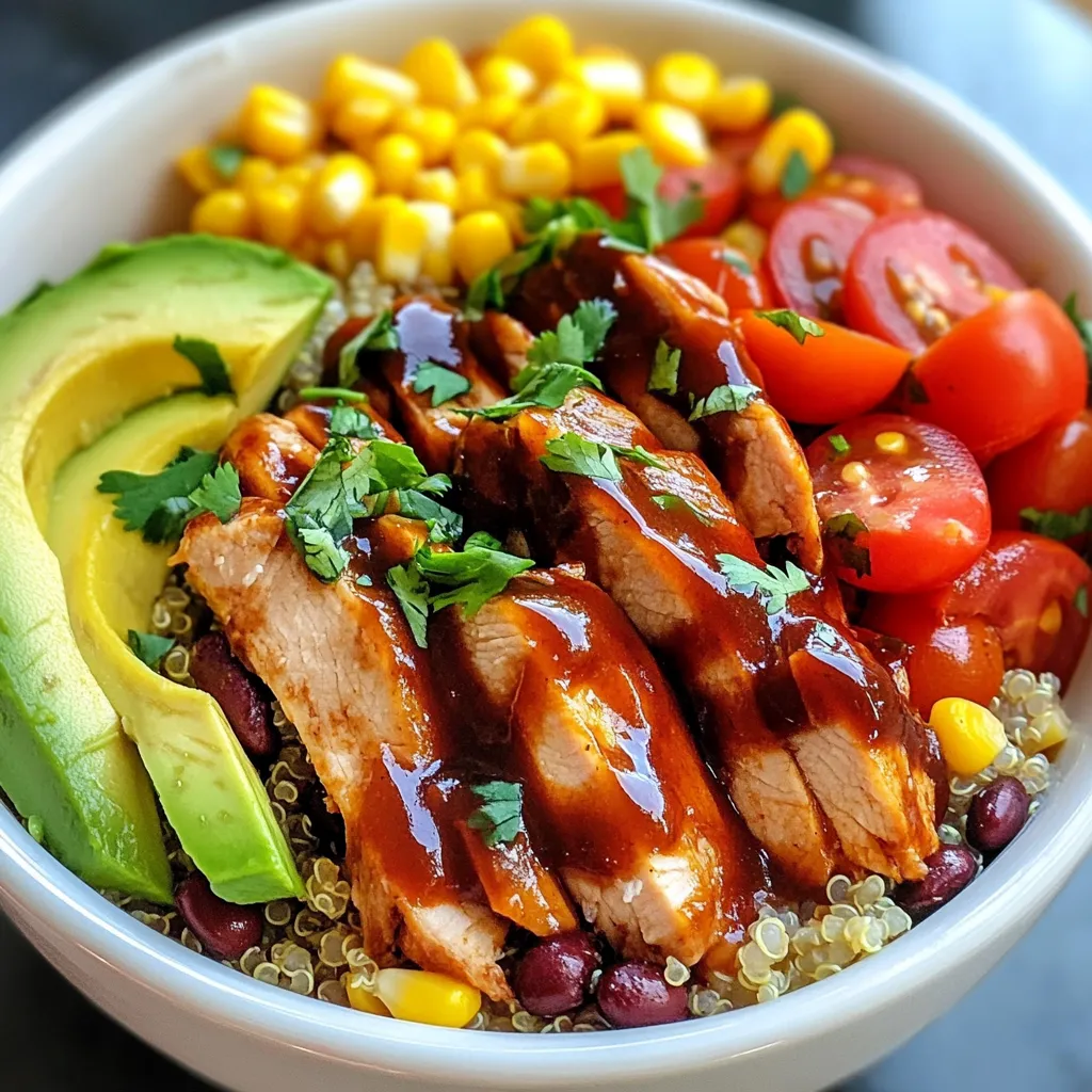 In large bowls, layer the cooked quinoa as the base. Top with sliced BBQ chicken, cherry tomatoes, avocado, corn, black beans, and red onion.