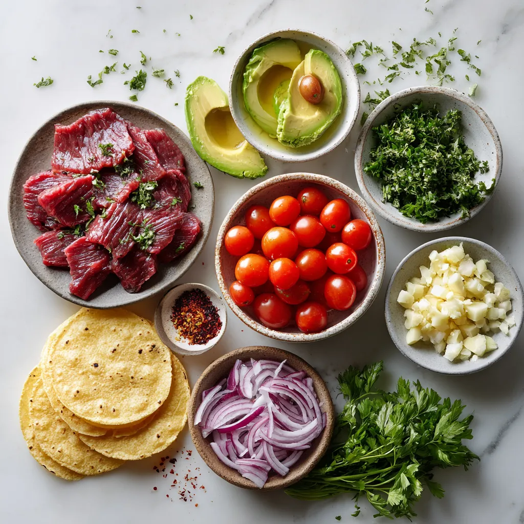 Time to build your tacos! First, warm the corn tortillas in a dry skillet. Just 30 seconds on each side will do. Take a tortilla and place a few slices of steak in the middle. Top it with halved cherry tomatoes, finely chopped red onion, and avocado slices. Don’t forget the chimichurri sauce! Add a generous spoonful on top. Finally, garnish with fresh cilantro. Now, your tacos are ready to be enjoyed!