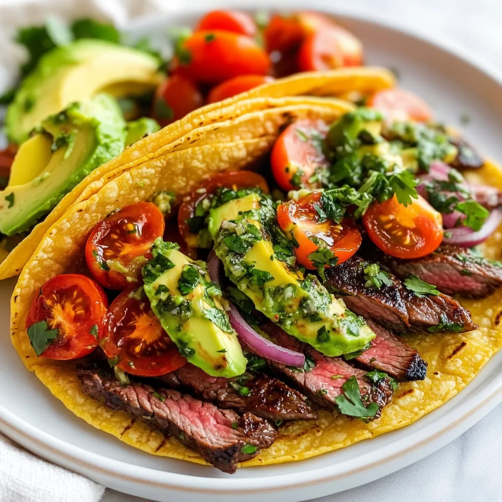 When building your tacos, use fresh corn tortillas. Warm them in a dry skillet for about 30 seconds. This makes them soft and easy to fold. Start with a few slices of the steak. Next, layer on cherry tomatoes, red onion, and avocado. These fresh toppings add crunch and flavor. Finally, drizzle a generous amount of chimichurri sauce on top. Garnish with fresh cilantro for a pop of color and taste. Serve with lime wedges for a zesty kick.