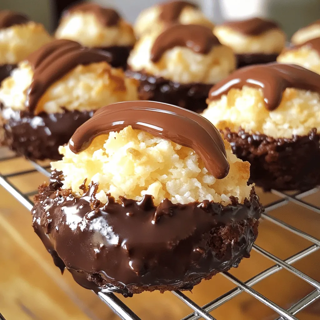 - 2 ¾ cups shredded unsweetened coconut - 2/3 cup sweetened condensed milk - 1 cup dark chocolate chips To make chocolate dipped coconut macaroons, you need three main ingredients. First, use shredded unsweetened coconut. This gives a great texture and pure coconut flavor. Next, sweetened condensed milk adds a rich sweetness and binds everything together. Finally, dark chocolate chips make the perfect topping, adding a rich chocolate taste. - 1 tablespoon coconut oil - 1 teaspoon vanilla extract - 1/4 teaspoon salt You can also use some optional ingredients. Coconut oil helps melt the chocolate smoothly. It gives a nice shine to the final product. Vanilla extract adds depth to the flavor, enhancing the sweetness. A bit of salt balances the sweetness of the condensed milk, making each bite more enjoyable. These extras are not required but can elevate your macaroons. Preheating the Oven First, turn on your oven. Set it to 325°F (160°C). This helps the macaroons bake evenly. While the oven warms up, line a baking sheet with parchment paper. This keeps them from sticking. Mixing the Ingredients In a large mixing bowl, add 2 ¾ cups of shredded unsweetened coconut and 2/3 cup of sweetened condensed milk. Use a spatula to stir until all the coconut is covered. Next, pour in 1 teaspoon of vanilla extract, 2 large egg whites, and 1/4 teaspoon of salt. Mix everything together until it looks smooth. Forming the Macaroons Now, it’s time to make the macaroons. Use a tablespoon or cookie scoop to grab some of the mixture. Shape it into small mounds. Place them on the baking sheet. Make sure to space them about 2 inches apart. Baking Time and Temperature Pop the baking sheet into the oven. Bake the macaroons for 20-25 minutes. They should turn a nice golden brown on top. When they look good, take them out and let them cool for about 10 minutes. Then, move them to a wire rack to cool completely. Melting the Chocolate Once the macaroons are cool, it’s chocolate time! In a microwave-safe bowl, add 1 cup of dark chocolate chips and 1 tablespoon of coconut oil. Heat them in the microwave in 30-second bursts. Stir after each round until the chocolate is smooth. Dipping and Drizzling Techniques Take each macaroon and dip the bottom into the melted chocolate. Let the extra chocolate drip off. Place the dipped macaroons back on the wire rack. If you want to make them extra special, drizzle some more chocolate on top. Let the chocolate set at room temperature, or pop them in the fridge to speed things up. How to Achieve Ideal Texture To get the best texture, use shredded unsweetened coconut. The coconut should be moist, not dry. Mixing it with sweetened condensed milk binds everything well. This mix makes the macaroons chewy and soft inside, with a nice golden crust outside. Aim for small mounds when you scoop them. This helps them bake evenly. Baking Tips for Even Color To ensure even color, space the macaroons two inches apart on the baking sheet. This allows heat to flow around them. Rotate the baking sheet halfway through baking. If you notice some macaroons browning faster, position them differently next time. A consistent oven temperature is key to achieving that perfect golden brown. Best Methods for Melting Chocolate For melting chocolate, I recommend using a microwave. Place dark chocolate chips and coconut oil in a microwave-safe bowl. Heat in 30-second bursts, stirring in between. This method helps you avoid burning the chocolate. You can also melt chocolate using a double boiler. Just place a bowl over simmering water, and stir until smooth. Avoiding Seizing Chocolate Chocolate can seize if it comes into contact with water. Keep all tools and bowls dry. If your chocolate does seize, try adding a teaspoon of coconut oil or vegetable oil. This can help restore the smooth texture. Remember, patience is key when melting chocolate. Slow and steady wins the race! {{image_2}} You can make your macaroons even more exciting. One great way is to add almond extract. Just a tiny bit will change the taste. It gives a nice nutty flavor that pairs well with coconut. You can also try seasonal flavors. For example, add pumpkin spice in fall or peppermint extract during winter. It makes your treats special for the season. Get creative and see what you like best! Switching up your chocolate can be fun too. Using white chocolate instead of dark chocolate makes a great twist. It gives a sweet and creamy taste that many people love. Just melt it the same way you do with dark chocolate. Another fun idea is to roll the macaroons in nuts or sprinkles. Chopped almonds or pistachios add crunch. Colorful sprinkles make them look festive. This way, you can match your macaroons to any event or party! To keep your chocolate dipped coconut macaroons fresh, you have two choices: room temperature or refrigeration. - Room Temperature: Store them in a cool, dry place. They stay fresh for about 3-5 days. - Refrigeration: If you want them to last longer, place them in the fridge. They can stay good for up to 2 weeks. Use an airtight container for both storage methods. This prevents moisture from getting in and keeps them crunchy. If you choose the fridge, make sure the container is snug. Freezing is a great option for long-term storage. It helps preserve the taste and texture. - How to Freeze for Better Longevity: First, let the macaroons cool completely. Next, place them on a baking sheet in a single layer. Freeze them for about 1-2 hours until solid. Once they are firm, transfer them to a freezer-safe bag or container. Be sure to remove as much air as possible. They can last up to 3 months in the freezer. - Thawing Instructions: To enjoy your frozen macaroons, take them out of the freezer. Let them thaw in the fridge for a few hours. If you're in a hurry, leave them at room temperature for about 30 minutes. Enjoy them fresh! How to Make Coconut Macaroons Without Egg? You can make coconut macaroons without egg. Use aquafaba inst