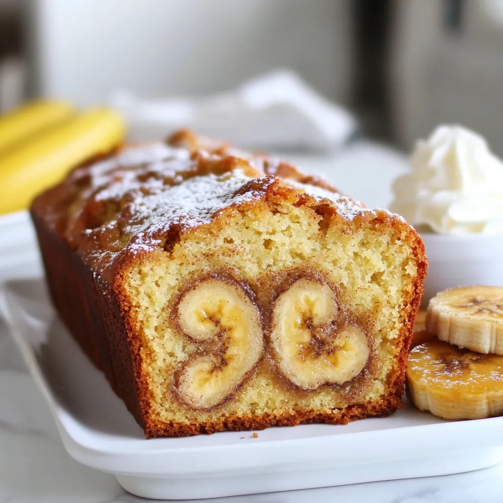 Slice the banana bread while it's still warm and serve it on a rustic wooden board. Garnish with a sprinkle of powdered sugar or a dollop of whipped cream on the side for an indulgent touch! You can also add additional caramelized banana slices on top for extra flair.