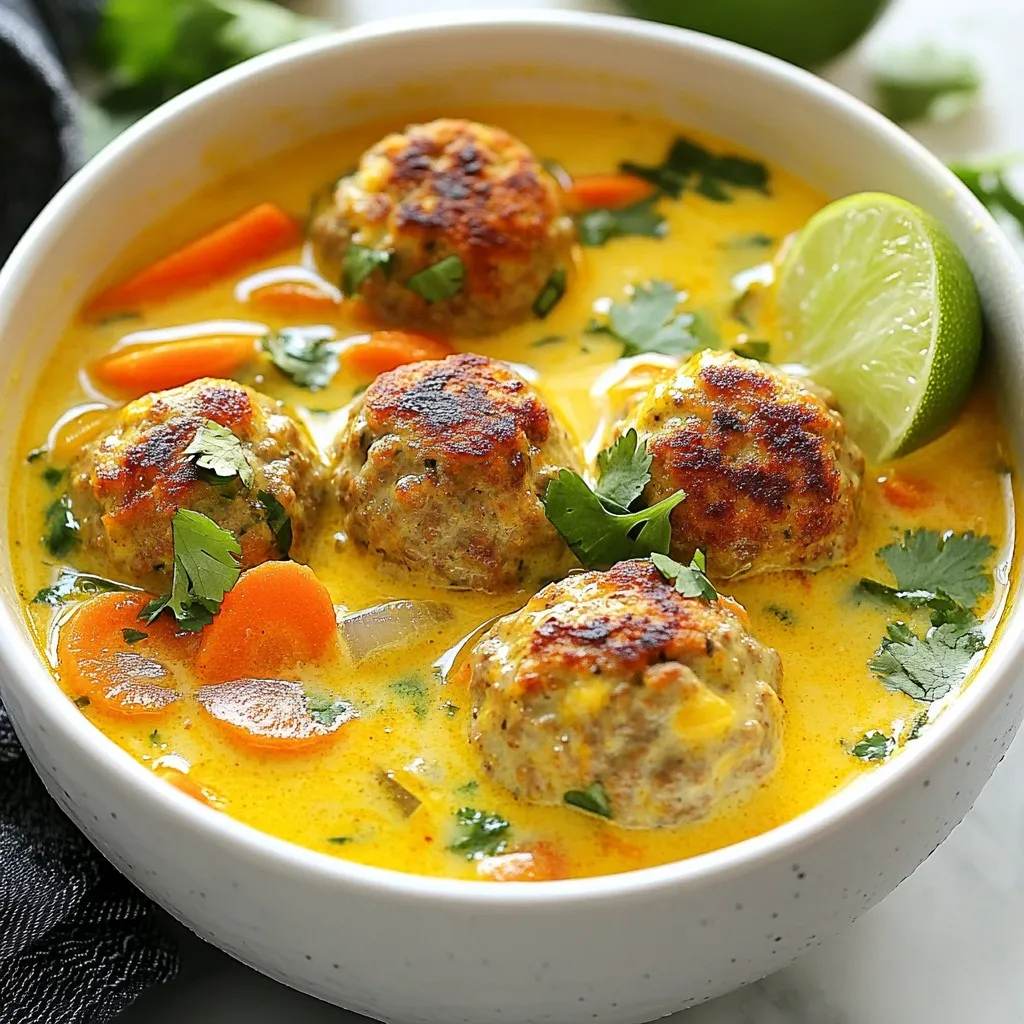 A flavorful and hearty soup featuring meatballs in a creamy coconut curry broth with fresh vegetables.