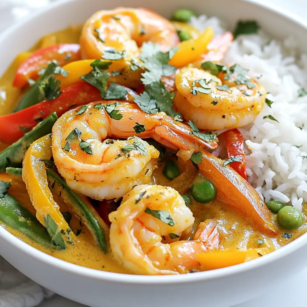 A flavorful shrimp dish cooked in a creamy coconut curry sauce with fresh vegetables.