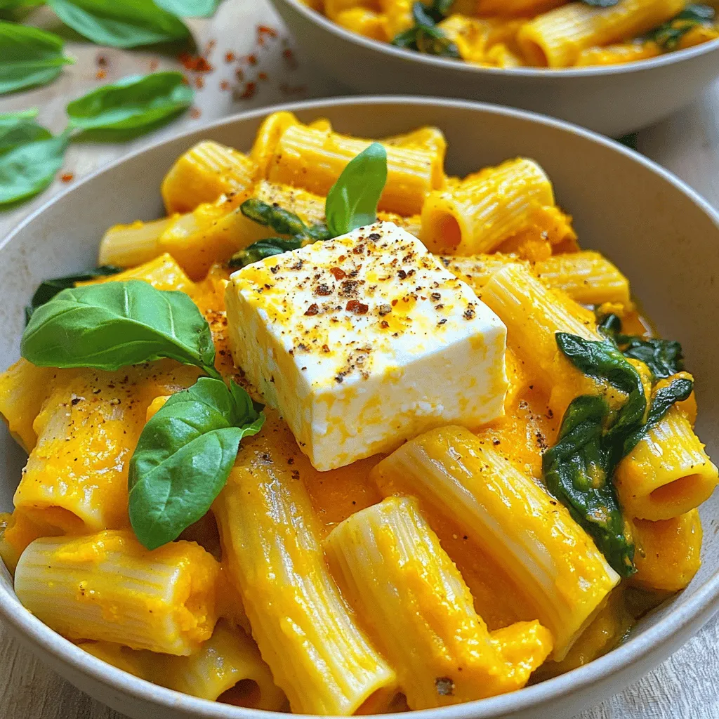 To make this creamy baked feta pumpkin pasta, you need a few key ingredients. Here is what you'll need: - 8 ounces pasta (penne or fusilli work well) - 1 cup pumpkin puree (canned or homemade) - 1 block (8 ounces) feta cheese - 2 tablespoons olive oil - 1 teaspoon garlic powder - 1 teaspoon dried thyme - ½ teaspoon red pepper flakes (adjust for spice preference) - Salt and pepper to taste - 1 cup spinach - ¼ cup grated Parmesan cheese (optional) - Fresh basil or parsley for garnish These ingredients come together to create a creamy and tasty dish that feels fancy but is quite simple. Choosing feta cheese can make a big difference in your dish. Look for feta that is creamy and soft, not too crumbly. Block feta works best because it melts nicely. You can find it in brine or vacuum-sealed. Feta in brine has a richer flavor. If you can, taste a few types to find your favorite. If you can't find pumpkin puree or want to switch it up, there are great alternatives. You can use butternut squash puree, which is sweet and creamy. Sweet potato puree is another option that adds a unique flavor. You could even try using a mix of these purees for a fun twist. First, set your oven to 400°F (200°C). This temperature helps the feta and pumpkin blend well. While it heats, gather your tools. You need a baking dish, a pot for pasta, and a fork for mixing. It’s best to have everything ready. This way, you can move quickly and keep things neat. Next, cook the pasta. Boil water in a pot and add salt for flavor. Once it boils, add 8 ounces of pasta. Cook it until it is al dente, which means it has a slight bite. This usually takes about 8-10 minutes. After cooking, drain the pasta and set it aside. You want it ready for mixing later. Now, it’s time to bake the feta and pumpkin. In your baking dish, place the block of feta in the middle. Pour 1 cup of pumpkin puree around it. Add 2 tablespoons of olive oil, 1 teaspoon of garlic powder, and 1 teaspoon of dried thyme. Sprinkle in ½ teaspoon of red pepper flakes, along with salt and pepper to taste. Mix these gently around the feta. This blend gives the dish great flavor. Put the dish in your preheated oven. Bake for about 25-30 minutes. You want the feta to be soft and golden on top. Once done, take it out and use a fork to mash the feta into the pumpkin puree. Mix until it becomes creamy. Finally, stir in your cooked pasta and 1 cup of fresh spinach. If you like, add ¼ cup of grated Parmesan cheese for extra creaminess. Your dish is nearly ready to serve! To make your pasta creamy, focus on the feta and pumpkin mix. After baking, mash the feta well into the pumpkin. This step is key. The more you mix, the creamier it gets. Add a splash of pasta water if needed. This will help bind everything together. Red pepper flakes add heat. Start with half a teaspoon if you're unsure. You can always add more. Taste the mix before serving. This way, you adjust the spice just right. If you love heat, feel free to add more. For a great look, serve pasta in wide bowls. Drizzle some olive oil on top. A sprinkle of red pepper flakes adds color. Finish with fresh herbs like basil or parsley. This makes your dish pop and look inviting. Enjoy making it look as good as it tastes! {{image_2}} You can easily add protein to this dish. Chicken breast or sausage works great. If you prefer beans, try chickpeas or white beans. Cook the protein separately. Add it to the pasta and sauce mix before serving. This makes the meal heartier and more filling. If you want a twist, use kale instead of spinach. Kale has a nice texture and adds a different flavor. Just chop it up and add it with the pasta. Cook it a bit longer if you want it softer. This keeps the dish healthy and tasty. Feel free to play with herbs and spices! Adding fresh herbs like basil or parsley makes it bright. You can also try rosemary or oregano for a warm taste. For a spicy kick, toss in more red pepper flakes or some black pepper. These small changes can really boost the flavor of your meal. After enjoying your creamy baked feta pumpkin pasta, store leftovers in an airtight container. Allow the pasta to cool first. This helps keep the flavors fresh. Place the container in the fridge. It will stay good for up to three days. If you want to enjoy it later, follow the freezing tips below. When you're ready to eat leftovers, reheat them gently. You can use the microwave or a pan on the stove. If using a microwave, heat in short bursts. Stir between each burst to warm evenly. On the stove, add a splash of water or olive oil. This will help bring back the creaminess. Heat on low to avoid drying it out. To freeze your creamy baked feta pumpkin pasta, use a freezer-safe container. Let it cool completely before sealing. Label the container with the date. You can freeze it for up to three months. When you're ready to eat, thaw it in the fridge overnight. Reheat as mentioned above to ensure it stays creamy and delicious. Yes, you can use fresh pumpkin. Just make sure to cook it first. Cut the pumpkin into pieces and roast or steam it until soft. Then, blend it until smooth. This will give your dish a fresh taste. You can use gluten-free pasta like rice or quinoa pasta. Zucchini noodles or spaghetti squash also work well. These options keep the dish tasty and light. Yes, you can prepare this dish ahead of time. Cook the pasta and bake the feta mix. Once cooled, store them in the fridge. When ready to serve, just heat and mix them together. To make this dish vegan, swap feta cheese for a plant-based feta. Use nutritional yeast for a cheesy flavor. Also, you can replace Parmesan with more nutritional yeast or vegan cheese. This blog post covered how to make creamy baked feta pumpkin pasta. We looked at key ingredients, including choosing the right feta and pumpkin puree alternatives. I shared step-by-step instructions to help you cook and bake effectively. Tips for creaminess and spice adjustments improved the dish’s flavor. We a