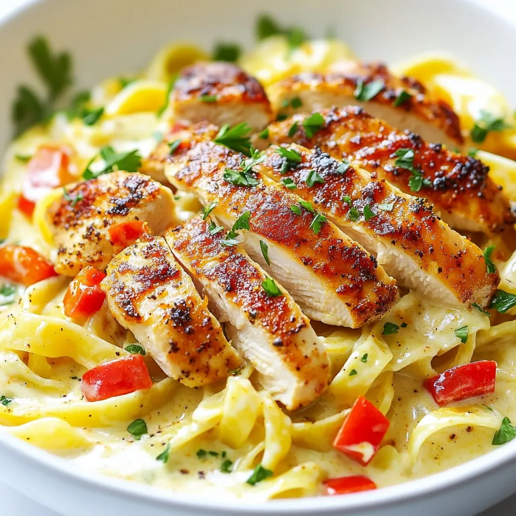Now, it’s time to bring everything together. Slice the cooked chicken and add it to the creamy sauce. Stir well to coat the chicken in that rich flavor. Then, add the cooked pasta to the skillet. Toss everything together until it’s well mixed. Taste and adjust with more salt and pepper if needed. Serve the pasta hot, garnished with chopped fresh parsley for a lovely touch. Enjoy your meal!