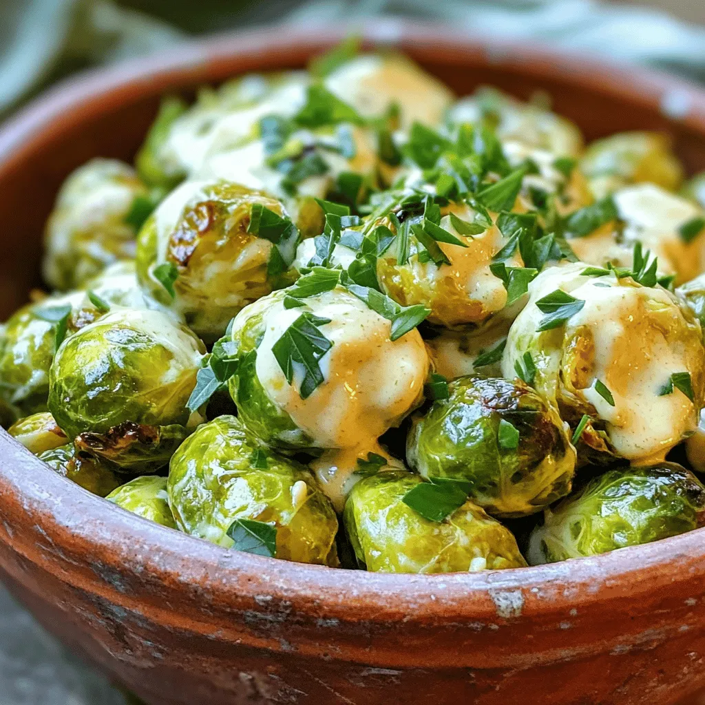 To make creamy garlic Parmesan Brussels sprouts, gather these items: - 1 lb Brussels sprouts, trimmed and halved - 3 tablespoons olive oil - 4 cloves garlic, minced - 1 cup heavy cream - 1 cup grated Parmesan cheese - 1 teaspoon salt - 1/2 teaspoon black pepper - 1/2 teaspoon red pepper flakes (optional for heat) - Fresh parsley, chopped (for garnish) If you want to switch things up, consider these swaps: - Use butter instead of olive oil for a richer flavor. - Swap heavy cream with half-and-half for a lighter dish. - Try nutritional yeast in place of Parmesan for a vegan touch. - If you dislike garlic, onion powder can work as a substitute. Feel free to personalize your Brussels sprouts with these extras: - Add cooked bacon bits for a smoky crunch. - Toss in some sun-dried tomatoes for a tangy bite. - Include pine nuts for a nutty flavor and texture. - For a zestier taste, mix in lemon zest before serving. First, preheat your oven to 400°F (200°C). This step is key for nice, crispy sprouts. While the oven heats, grab 1 pound of Brussels sprouts. Trim the ends and cut each sprout in half. Toss these in a large bowl with 3 tablespoons of olive oil. Sprinkle in 1 teaspoon of salt, 1/2 teaspoon of black pepper, and, if you like it spicy, 1/2 teaspoon of red pepper flakes. Mix well. Spread the coated Brussels sprouts on a baking sheet in a single layer. This helps them roast evenly. Place the sheet in your preheated oven. Roast for 20-25 minutes until they turn golden brown and tender. Don’t forget to toss them halfway through cooking for perfect roasting. While the sprouts roast, start on the creamy garlic sauce. In a large skillet, heat over medium heat. Add 4 minced garlic cloves and sauté for 1-2 minutes. You want the garlic to smell great but not burn. Next, pour in 1 cup of heavy cream. Bring it to a gentle simmer. Lower the heat and stir in 1 cup of grated Parmesan cheese. Keep stirring until the cheese melts, creating a smooth sauce. Season with extra salt and pepper to taste. Once the Brussels sprouts are done roasting, add them to the skillet with the creamy sauce. Gently toss to coat each sprout in the sauce. Let everything cook together for an extra 2-3 minutes. This mingles the flavors beautifully. Serve warm and garnish with chopped fresh parsley. This adds a pop of color and freshness to your dish. Enjoy your delightful creamy garlic Parmesan Brussels sprouts! When picking Brussels sprouts, look for bright green ones. They should feel firm and dense. Avoid any that look yellow or have brown spots. Fresh sprouts are small and tight. If they are loose, they are not fresh. Try to choose similar sizes for even cooking. To get a creamy sauce, use heavy cream. Heat it gently, and don’t let it boil. Stir in the Parmesan slowly. If the sauce is too thick, add a splash of water or more cream. If it’s too thin, let it cook a bit longer. This helps the flavors blend well. Add minced garlic to the oil for more taste. You can sprinkle in red pepper flakes for some spice. Fresh herbs like thyme or rosemary can also boost flavor. A squeeze of lemon juice adds brightness. Experiment with different cheese, like gouda or feta, for a twist. {{image_2}} You can add protein to your creamy garlic Parmesan Brussels sprouts. Chicken or bacon works great. For chicken, use cooked, shredded chicken. Mix it in with the sprouts and sauce. For bacon, cook it until crispy, then crumble it on top. This adds a nice crunch and flavor. If you want a vegetarian twist, try adding beans. White beans work well. They give protein and a creamy texture. You can also add nuts like walnuts or pecans. They add a nice crunch and richness. You can change the sauce or seasoning for fun. Try adding lemon juice for a fresh zing. If you like heat, add more red pepper flakes. You can also use different cheeses like feta or goat cheese. Each will give a new flavor to this dish. Experiment with herbs too, like thyme or rosemary, for extra warmth. You can store your creamy garlic Parmesan Brussels sprouts in an airtight container. Make sure they cool down first. Place them in the fridge for up to three days. They will stay fresh and tasty. To reheat, use a skillet over medium heat. Add a splash of cream or oil to keep them moist. Stir them gently until they warm through. This should take about 5-7 minutes. You can also use a microwave. Heat in short bursts of 30 seconds, stirring in between. If you want to freeze them, let the sprouts cool completely. Place them in a freezer-safe bag or container. Remove as much air as possible to prevent freezer burn. They can last up to two months in the freezer. When you're ready to eat, thaw them overnight in the fridge before reheating. To reduce bitterness in Brussels sprouts, try these tips: - Trim the ends: Cut off the stem ends before cooking. - Halve them: Cutting them in half helps to cook them evenly. - Roast with oil: Toss with olive oil to enhance the flavor. - Add sweetness: A drizzle of honey or maple syrup can help. These steps make your Brussels sprouts taste better and more enjoyable. Yes, you can use frozen Brussels sprouts. However, they may not taste as fresh. Here’s how to use them: - Thaw before cooking: Let them sit in the fridge overnight or run under water. - Adjust cooking time: Frozen sprouts need a little longer to cook. - Roast them well: Ensure they are crispy and well-cooked for the best flavor. Using frozen sprouts is convenient and can still yield tasty results. Creamy garlic Parmesan Brussels sprouts pair well with many dishes. Here are a few ideas: - Grilled chicken: The flavors complement each other nicely. - Pasta: Serve them on the side with your favorite pasta dish. - Steak: A juicy steak balances the creaminess of the sprouts. - Rice: Pair with a bed of rice for a filling meal. These options create a delightful and satisfying meal that everyone will love. This blog post covered all aspects of making creamy garlic Parmesan Brussels sprouts. We lo