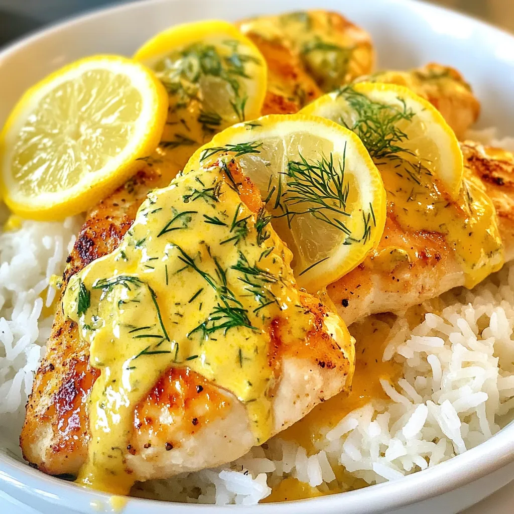 Plate the chicken on a bed of steamed rice or buttery mashed potatoes, garnished with fresh dill and lemon slices.