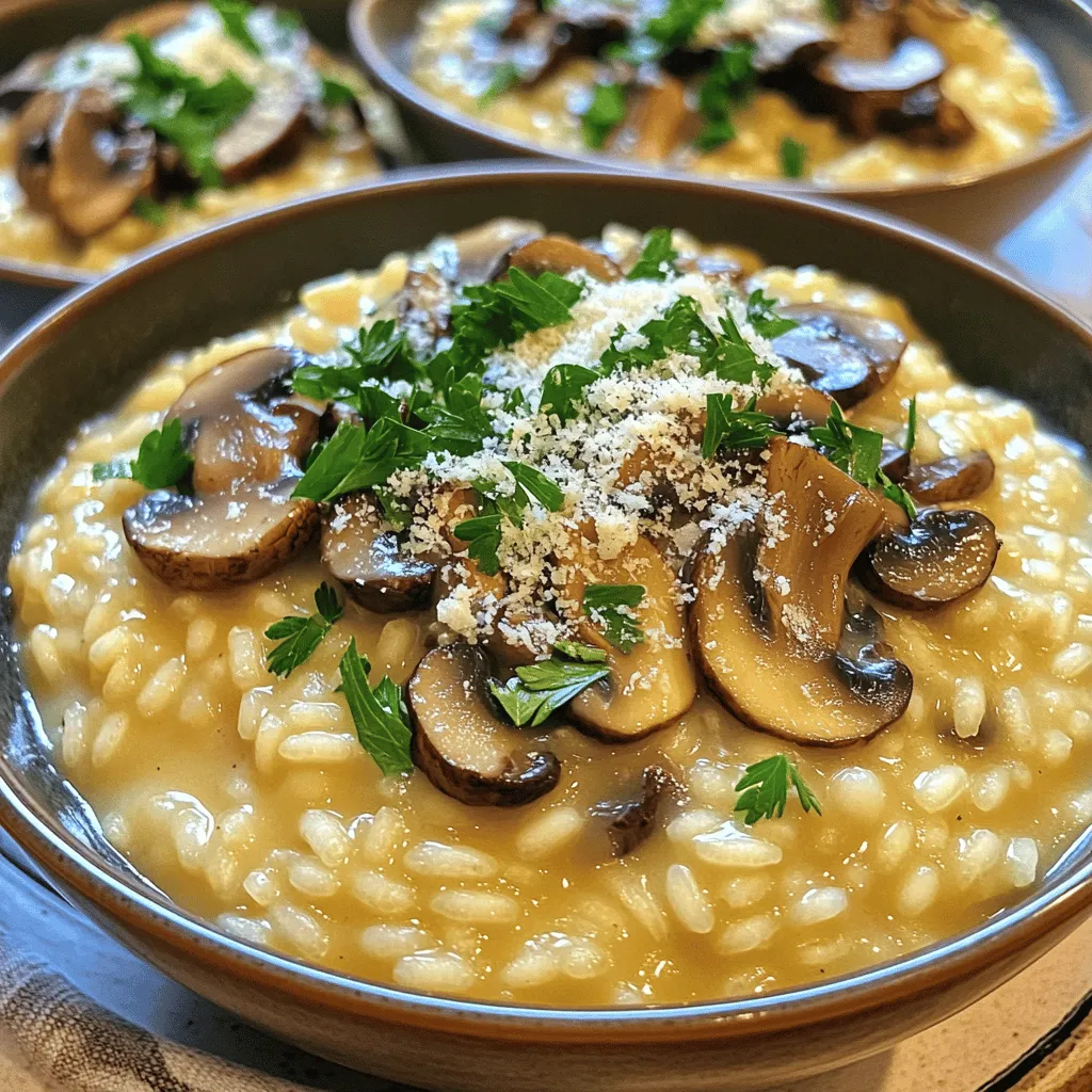 To make a creamy mushroom risotto, you will need: - 1 cup Arborio rice - 4 cups vegetable broth - 2 tablespoons olive oil - 1 small onion, finely chopped - 2 cloves garlic, minced - 8 oz mixed mushrooms (cremini, shiitake, etc.), sliced - 1/2 cup grated Parmesan cheese - 1/4 cup heavy cream - 2 tablespoons chopped fresh parsley - Salt and black pepper to taste Using fresh ingredients is key to great flavor. Fresh mushrooms add depth and earthiness. A good vegetable broth will enhance the taste of the dish. Fresh parsley brings color and brightness. The quality of Parmesan cheese makes a big difference in creaminess. All these factors help create a rich and satisfying risotto. If you have dietary needs, you can make swaps. For a vegan risotto, use plant-based cheese and cream. Instead of Arborio rice, you can try quinoa for a gluten-free option. If you want less fat, leave out the heavy cream. You can also use low-sodium broth for a healthier choice. These changes keep the dish delicious while meeting your needs. Start with your broth. Pour 4 cups of vegetable broth into a medium saucepan. Heat it over low heat. Keep it warm, but do not let it boil. This step is key. Warm broth helps the rice cook evenly. Next, grab a large skillet. Heat 2 tablespoons of olive oil over medium heat. Add 1 small, finely chopped onion. Sauté it for 3-4 minutes. You want it to turn translucent. Then, add 2 minced garlic cloves and 8 ounces of sliced mixed mushrooms. Cook this mixture for 5-7 minutes. Stir often until the mushrooms soften and release their moisture. This blend of flavors is essential for your risotto. Now it’s time for the rice. Add 1 cup of Arborio rice to the skillet. Stir it for 1-2 minutes. Let it toast slightly and soak up the flavors. Then, begin adding your warm vegetable broth. Use one ladle at a time. Stir continuously. Wait until most of the liquid is absorbed before adding more. Repeat this for about 20-25 minutes. You want the rice to be creamy and al dente. Once done, lower the heat. Stir in 1/2 cup of grated Parmesan cheese and 1/4 cup of heavy cream. Mix until it’s creamy and smooth. Season with salt and black pepper to taste. Finally, fold in 2 tablespoons of chopped fresh parsley for a pop of color and flavor. To make your risotto creamy, use Arborio rice. This rice has extra starch. When you stir, it releases this starch. Keep adding broth slowly to help the rice absorb moisture. Stirring is key! It helps the rice cook evenly and stay creamy. Mixing in heavy cream and Parmesan cheese at the end gives a nice finish. Start with warm broth. This helps the rice cook faster. Use a wide, shallow pan to spread the rice. This exposes more rice to heat. Sauté onions and mushrooms first to build flavor. Add the rice next, letting it toast a bit. Then, add one ladle of broth at a time. Wait until it's almost gone before adding more. Don’t rush the process. Adding too much broth at once can make the rice soggy. Avoid cooking on high heat; it can burn the rice. If you skip stirring, the rice may stick to the pan. Lastly, don’t forget to taste as you go! Adjust salt and pepper to your liking. {{image_2}} You can boost your risotto with proteins. Chicken is a great choice. Cook diced chicken in the skillet before adding onions. Shrimp also works well. Sauté shrimp until pink, then add mushrooms. This adds flavor and makes your dish heartier. Herbs and spices can change the flavor of your risotto. Try adding fresh thyme or rosemary for a fragrant touch. You may also sprinkle in some red pepper flakes for heat. A hint of lemon zest can brighten the dish. These additions make each bite exciting and unique. Mushrooms are key to risotto. Use a mix of mushrooms for depth. Cremini and shiitake are perfect together. You can also try portobello for a meaty texture. Mixing different mushrooms brings out diverse flavors. Experimenting will make your risotto special every time. To keep your creamy mushroom risotto fresh, store it in an airtight container. Let it cool to room temperature first. This helps avoid excess moisture. Place it in the fridge if you plan to eat it within three days. For longer storage, consider freezing it. When reheating risotto, add a splash of broth or water. This keeps it creamy and prevents it from drying out. Heat it on the stove over low heat. Stir often to ensure even warmth. You can also use the microwave. Just cover it loosely with a lid and stir halfway through. To freeze risotto, portion it into smaller containers. Allow it to cool completely. Seal each container tightly to prevent freezer burn. It can last up to three months in the freezer. When ready to use, thaw it overnight in the fridge. Reheat as mentioned above for the best texture. Arborio rice is a short-grain rice. It comes from Italy and is perfect for risotto. This rice has a high starch content. This starch makes the risotto creamy. Arborio rice absorbs flavors well, adding a rich taste to your dish. You can find it in most grocery stores or online. You know risotto is done when the rice is creamy and al dente. The rice should be tender but still firm to the bite. You can taste it to check the texture. If it feels too hard, cook it a bit longer. The risotto should flow slowly when you stir it. Yes, you can make risotto without Parmesan cheese. You can use nutritional yeast for a cheesy flavor. Another option is to add other cheeses like goat cheese or cheddar. You can also skip cheese and use more cream for richness. If your risotto is too watery, cook it a bit longer. Keep the heat on low and stir often. This will help absorb the extra liquid. You can also add a bit more rice to thicken it. Be careful not to overcook the rice in this case. This blog post explored the key ingredients, step-by-step instructions, and useful tips for making risotto. We discussed the importance of fresh ingredients and substitutions for dietary needs. I shared techniques to achieve that creamy texture and common m