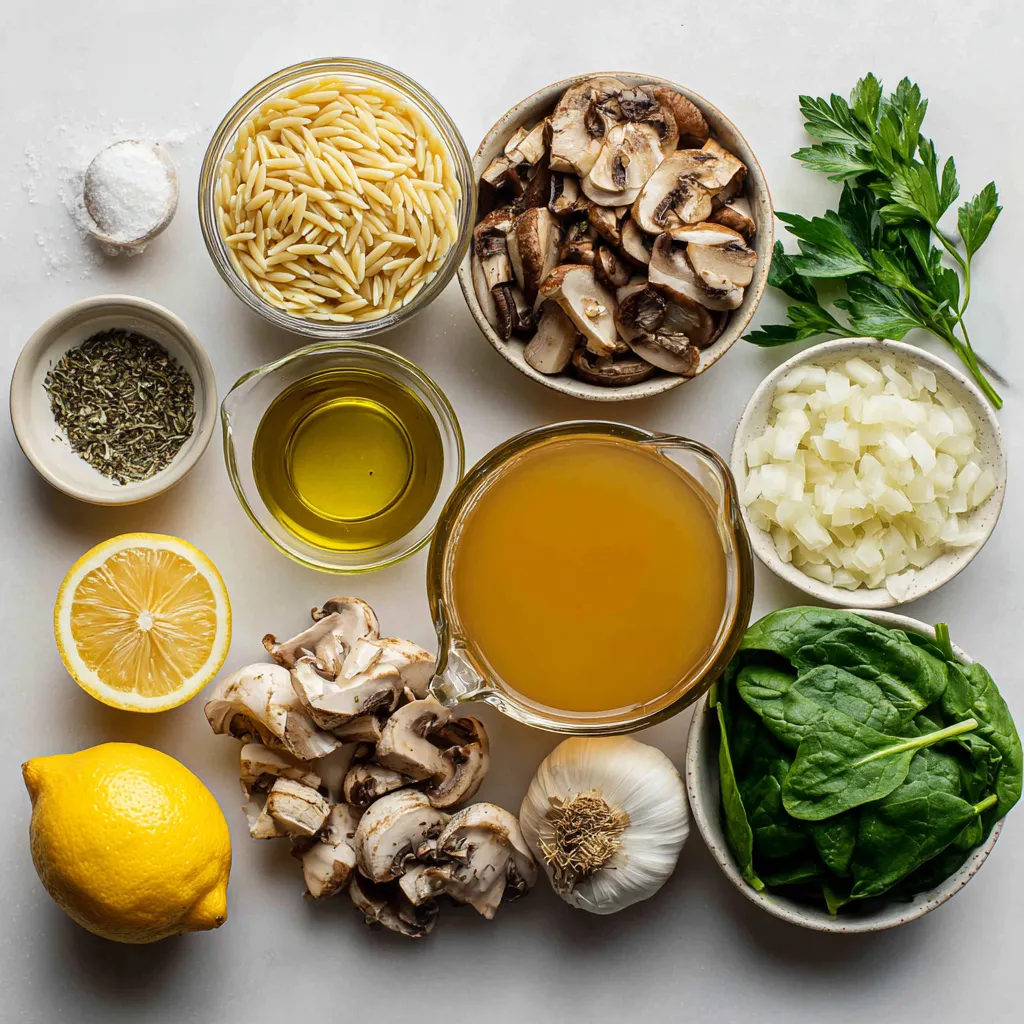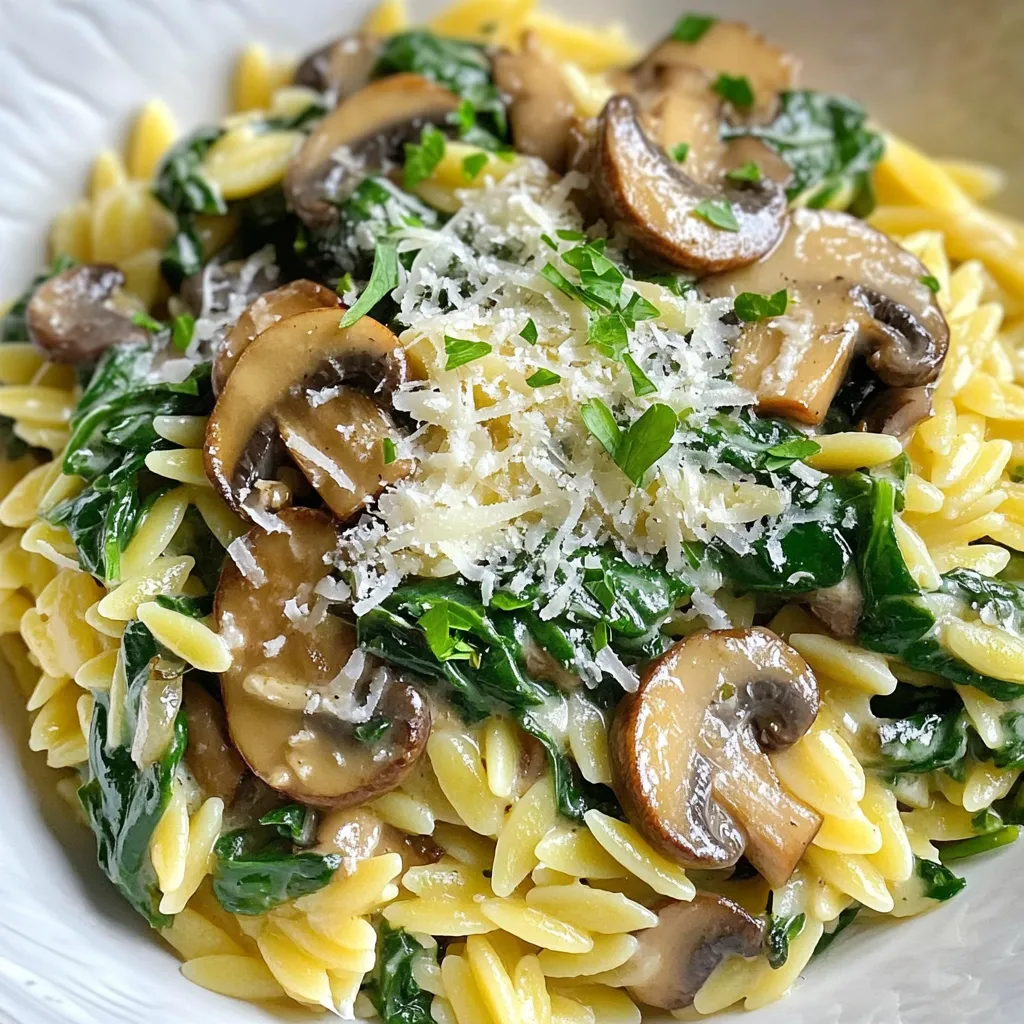 Here is everything you need for creamy mushroom spinach orzo. Gather these simple items: - 1 cup orzo pasta - 2 tablespoons olive oil - 1 medium onion, diced - 3 cloves garlic, minced - 8 oz mushrooms, sliced (button or cremini) - 3 cups fresh spinach - 1 cup vegetable broth - 1 cup heavy cream or coconut cream - 1/2 cup grated Parmesan cheese (optional) - Salt and pepper to taste - 1 teaspoon dried thyme - 1 teaspoon lemon zest - Optional: Fresh parsley for garnish This list makes it easy to prepare a tasty meal. You can adjust some items based on your taste. For example, if you like mushrooms, add more. If you need a vegan option, use coconut cream and skip the cheese. Each ingredient plays an important role in building flavor and texture. Enjoy the cooking process and the delicious results! {{ingredient_image_1}} To start, fill a medium pot with water and add salt. Bring this salted water to a rolling boil. Next, add 1 cup of orzo pasta to the boiling water. Cook it according to the package instructions until it's al dente, usually about 8 to 10 minutes. Once done, drain the orzo and set it aside for later. In a large skillet, pour in 2 tablespoons of olive oil and heat over medium heat. When the oil is hot, add the diced onion. Sauté the onion for about 3 to 4 minutes until it softens. Then, stir in 3 cloves of minced garlic and cook for another minute. You will love the aroma that fills your kitchen! Add 8 ounces of sliced mushrooms to the skillet. Cook them for about 5 to 6 minutes, stirring occasionally. You want to ensure they turn golden brown and lose any excess moisture. This step adds a deep flavor to your dish. Next, stir in 3 cups of fresh spinach. Cook it for about 2 to 3 minutes until it wilts. After that, pour in 1 cup of vegetable broth. Bring this mixture to a gentle simmer. Lower the heat and mix in 1 cup of heavy cream or coconut cream. Add in 1 teaspoon of dried thyme, 1 teaspoon of lemon zest, and salt and pepper to taste. Let the sauce simmer gently for 3 to 4 minutes to thicken slightly. Now it's time to combine! Add the cooked orzo to the skillet. Stir it well until the orzo is fully coated with that creamy sauce. If you like, mix in 1/2 cup of grated Parmesan cheese until it melts and blends in nicely. Taste your dish and adjust the flavors. You might want to add more salt, pepper, or lemon zest. For a nice presentation, divide the creamy mushroom spinach orzo among plates or bowls. If you have fresh parsley, sprinkle some on top. Enjoy this delightful meal! To cook your orzo just right, start with salted water. This adds flavor. Bring the water to a rolling boil. Add your orzo and cook for about 8 to 10 minutes. Check for doneness a minute early. You want it al dente, meaning it should still have a slight bite. Once done, drain it right away. If you let it sit, it may become too soft. To make your orzo dish even tastier, use fresh herbs and spices. Dried thyme adds a nice touch. You can also try fresh basil or parsley. Lemon zest brightens the dish and gives a fresh taste. Consider adding a pinch of red pepper flakes for heat. The right mix of flavors makes a big difference. For a creamy dish, heavy cream works well. If you want a lighter option, use coconut cream. This keeps it rich but reduces fat. You can also try a blend of both. Start with half a cup of cream, then add more if you want it creamier. Always taste as you go. Adjust salt and pepper to your liking. Pro Tips Use Fresh Ingredients: Fresh spinach and mushrooms will enhance the flavor and texture of your dish. Opt for organic produce when possible for the best results. Customize Your Creaminess: If you want a lighter option, use coconut cream instead of heavy cream. It adds a unique flavor while keeping the dish creamy. Season in Layers: Make sure to taste and adjust your seasoning at each step of the cooking process. This helps build flavor and ensures a well-seasoned final dish. Garnish for Presentation: Don’t skip the fresh parsley garnish! It adds a pop of color and freshness that elevates the overall presentation of your dish. {{image_2}} You can make this dish gluten-free. Just use gluten-free orzo. Many stores sell this option now. You can also try rice or quinoa for a different twist. Both pair well with the creamy sauce. Want to boost the veggie power? You can add bell peppers, zucchini, or peas. Broccoli works great too! Think about what’s in season. Fresh veggies taste best. They also add color and texture. Want to make it heartier? Try adding chicken or shrimp. Cook these separately and mix them in. You can also add tofu for a plant-based option. It soaks up the flavors well and adds protein. To store leftovers, let the creamy mushroom spinach orzo cool down. Place it in an airtight container. This helps keep it fresh and tasty. Store it in the fridge. It can last for about 3 to 4 days. Make sure to reheat only the portion you want to eat. You can freeze this dish for longer storage. First, let it cool completely. Then, scoop the orzo into freezer-safe bags or containers. Try to remove as much air as possible to prevent freezer burn. It can last in the freezer for up to 2 months. When you're ready to enjoy it again, take the orzo out and thaw it in the fridge overnight. Reheat it gently on the stove or in the microwave. Add a splash of broth or cream for best results. This keeps the dish creamy and smooth. Creamy mushroom spinach orzo lasts about three to four days in the fridge. Store it in an airtight container to keep it fresh. When you reheat it, add a splash of broth or cream. This helps bring back the creamy texture. Yes, you can use different types of mushrooms. Button and cremini mushrooms work well. Shiitake or portobello mushrooms add a richer flavor. Just slice them and follow the same cooking steps. Feel free to mix them for a unique taste! Absolutely! You can make this recipe vegan by substituting the heavy cream with coconut cream or cashew cream. Use nutritional yea