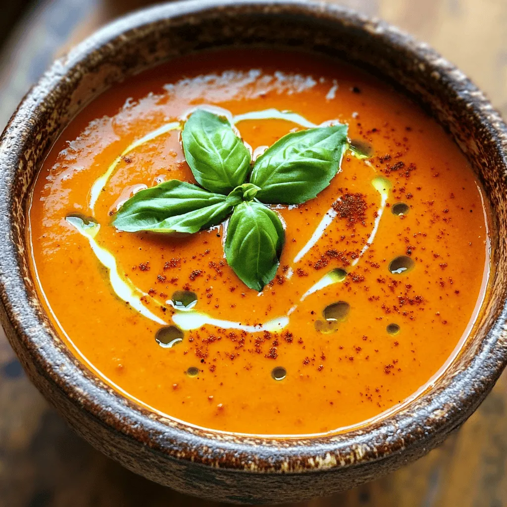 - 4 large red bell peppers, halved and seeded - 1 medium onion, diced - 2 cloves garlic, minced - 3 cups vegetable broth - 1 cup coconut milk (or heavy cream) - 1 tablespoon olive oil - 1 teaspoon smoked paprika - Salt and pepper to taste - Fresh basil for garnish (optional) If you want to make changes, you can! Use yellow or orange bell peppers if red ones are not available. They will still give great flavor. For a different taste, try using chicken broth instead of vegetable broth. If you prefer, you can swap coconut milk for almond milk or regular milk. Just know that it changes the taste slightly. You can also omit the cream for a lighter soup. Always choose bell peppers that are firm and shiny. Look for ones with smooth skin and no spots. When picking an onion, it should feel heavy for its size. Avoid ones that are soft or have dark spots. Fresh garlic should be firm and have no green shoots. For the best broth, choose one with low sodium. This lets you control the salt in your soup. If you want fresh basil, look for bright green leaves without any brown spots. To start, gather your ingredients. You need four large red bell peppers, one medium onion, two cloves of garlic, and three cups of vegetable broth. Don't forget one cup of coconut milk or heavy cream, a tablespoon of olive oil, smoked paprika, and some salt and pepper. Fresh basil is optional for garnish. Next, preheat your oven to 400°F (200°C). Cut the red bell peppers in half, remove the seeds, and place them cut side down on a baking sheet lined with parchment paper. Roast them for about 25-30 minutes. You want the skins to be blistered and blackened. Once the peppers are done, take them out of the oven. Let them cool for about 10 minutes. Then, peel off the skins. Next, heat olive oil in a large pot over medium heat. Add the diced onion and cook until it is soft and clear, about 5-7 minutes. After that, add minced garlic and smoked paprika. Cook for one more minute until you can smell the garlic and paprika. Now, add the peeled roasted red peppers to the pot. Pour in the vegetable broth and stir everything together. Turn up the heat until it boils. After it boils, reduce the heat and let it simmer for 10 minutes. This lets all the flavors mix well. After simmering, it’s time to blend the soup. You can use an immersion blender right in the pot for a smooth texture. If you don't have one, carefully transfer the mixture to a regular blender in batches. Once it is smooth, stir in the coconut milk or heavy cream. Return the soup to low heat for about 5 minutes to warm it up. Finally, taste the soup and add salt and pepper as needed. Now, it’s ready to serve hot. If you like, you can garnish with fresh basil. Enjoy! To make your soup even tastier, try adding more spices. You can use cumin or chili powder for a kick. A splash of lemon juice can brighten up the flavors too. If you love a smoky taste, add more smoked paprika. Remember, tasting as you go is key! This soup pairs well with crusty bread or a fresh salad. You can also serve it with a grilled cheese sandwich for a classic combo. For a fancy touch, serve it in a bowl with a drizzle of olive oil on top. This makes the dish look special and adds extra flavor. Garnishing your soup can make it more appealing. Fresh basil adds a nice pop of color and a hint of freshness. You can also add a dollop of sour cream or yogurt for creaminess. Croutons add a fun crunch. Lastly, a sprinkle of red pepper flakes gives a nice visual and a bit of heat! {{image_2}} You can easily make this soup vegan and dairy-free. Simply use coconut milk instead of heavy cream. Coconut milk makes the soup creamy and rich without any dairy. You can also add a splash of lemon juice for a bright flavor. If you love heat, add some spice! Try mixing in red pepper flakes or a chopped jalapeño. You can also use smoked paprika for a smoky twist. Spice adds depth and warmth. Adjust the amount to match your taste. Feel free to get creative with your veggies! You can add carrots, zucchini, or even sweet potatoes. Just chop them small and sauté them with the onion. This adds extra flavor and nutrients. Mixing in different veggies keeps the soup fun and exciting. After enjoying your creamy roasted red pepper soup, let it cool down. Pour the soup into an airtight container. Seal it tightly to keep it fresh. Store it in the fridge for up to four days. It’s best to eat it within this time for great taste. If you want to keep it longer, consider freezing it. To freeze the soup, use freezer-safe containers or bags. Make sure to leave some space in the container. The soup will expand as it freezes. Label each container with the date. You can freeze the soup for up to three months. When ready to enjoy, you can thaw it in the fridge overnight. To reheat, you have two good options. You can use the stove or the microwave. If using the stove, pour the soup into a pot. Heat over medium heat, stirring often. If using the microwave, pour the soup into a safe bowl. Heat it in short bursts, stirring in between. Make sure it is hot all the way through before serving. Enjoy your warm, creamy soup! You can use heavy cream instead of coconut milk. It adds a rich flavor. If you prefer a lighter option, try almond milk. Soy milk also works well but may alter the taste slightly. Yes, you can use canned roasted red peppers. They save time and still taste great. Just drain them well before adding to the pot. This keeps the soup from becoming too watery. To thicken the soup, add more roasted peppers. You can also blend in a potato for extra creaminess. Another option is to simmer the soup longer to reduce it. This will make it richer and thicker. You learned about key ingredients for soup, with helpful substitutions and tips for freshness. We covered clear steps for preparation, cooking, and blending to achieve the perfect texture. I shared tricks to enhance flavor, great serving ideas, and fun garnish options. You also explored va