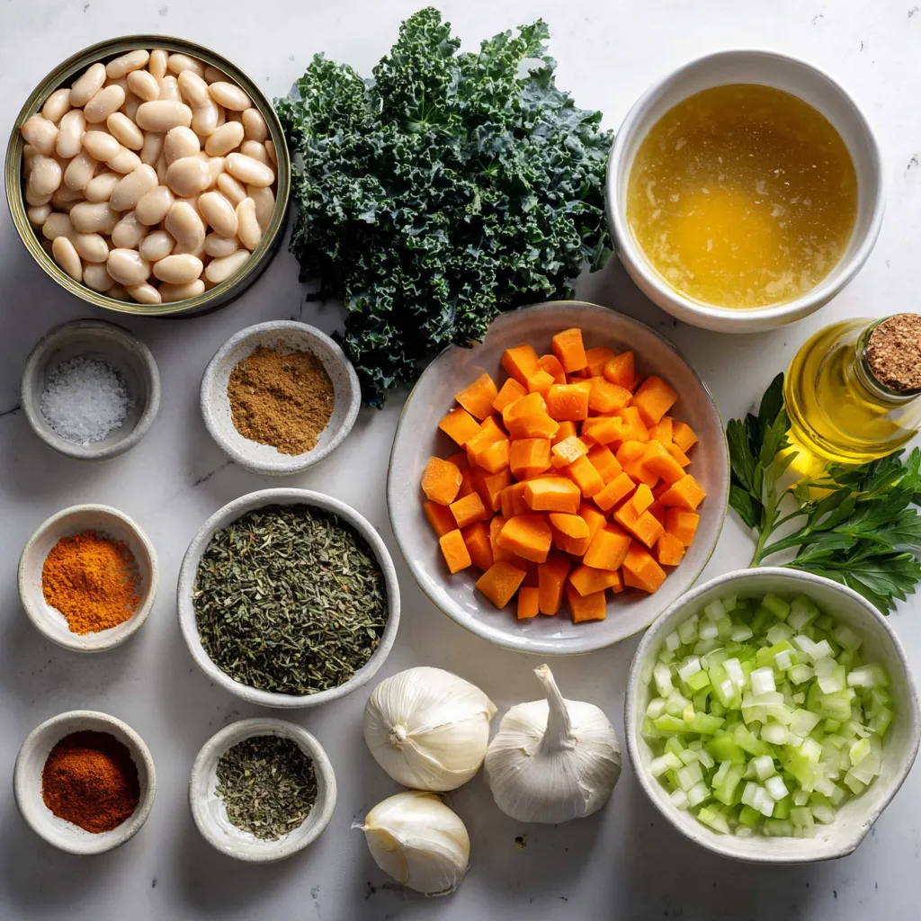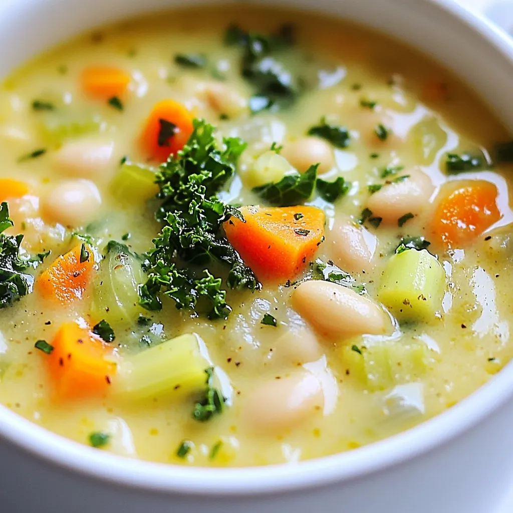 A rich and creamy soup made with white beans, vegetables, and kale, perfect for a comforting meal.