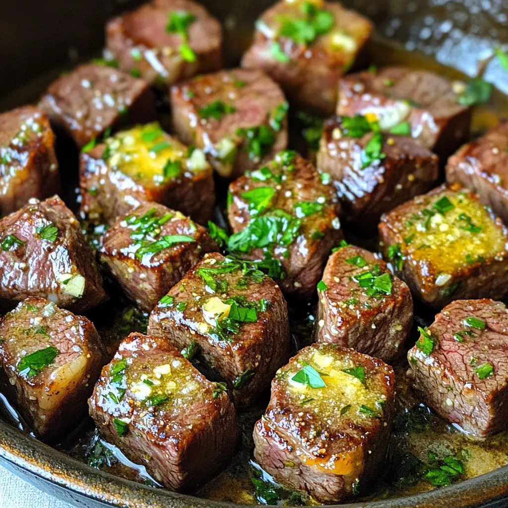 Now, return the cooked steak bites to the skillet. Toss them in the garlic herb butter until they are well coated. This step makes sure every bite is packed with flavor. Remove the skillet from heat and garnish with fresh parsley before serving. Enjoy these steak bites as a tasty appetizer or with your favorite sides!