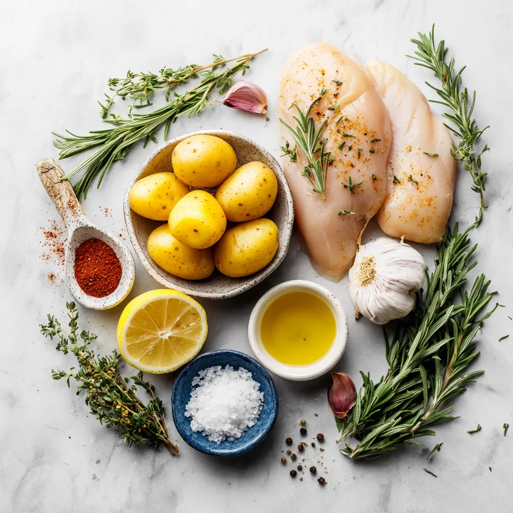 A delicious and flavorful dish featuring tender chicken breasts and baby potatoes, seasoned with garlic and fresh herbs.