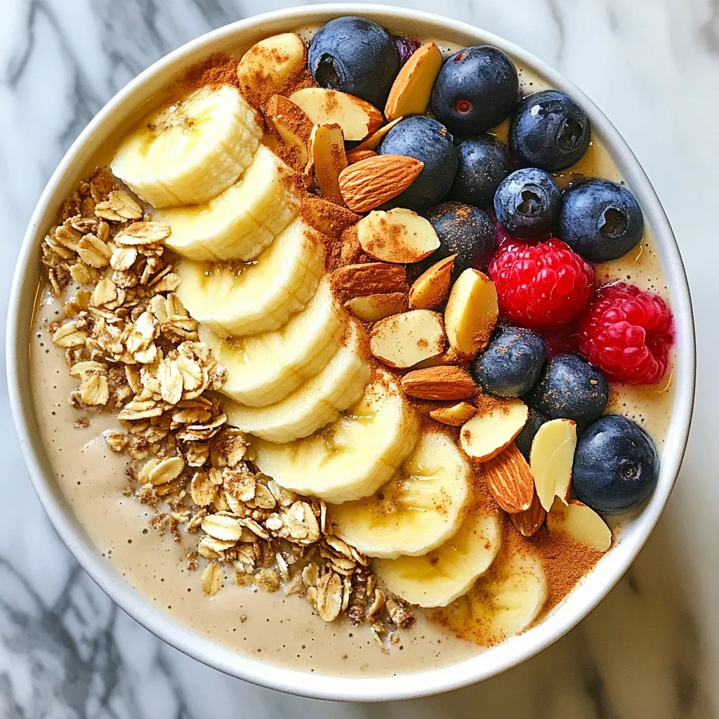 Decorate the top of the smoothie bowl with your choice of toppings: sliced almonds, granola, banana slices, mixed berries, and a sprinkle of cinnamon for an extra kick.