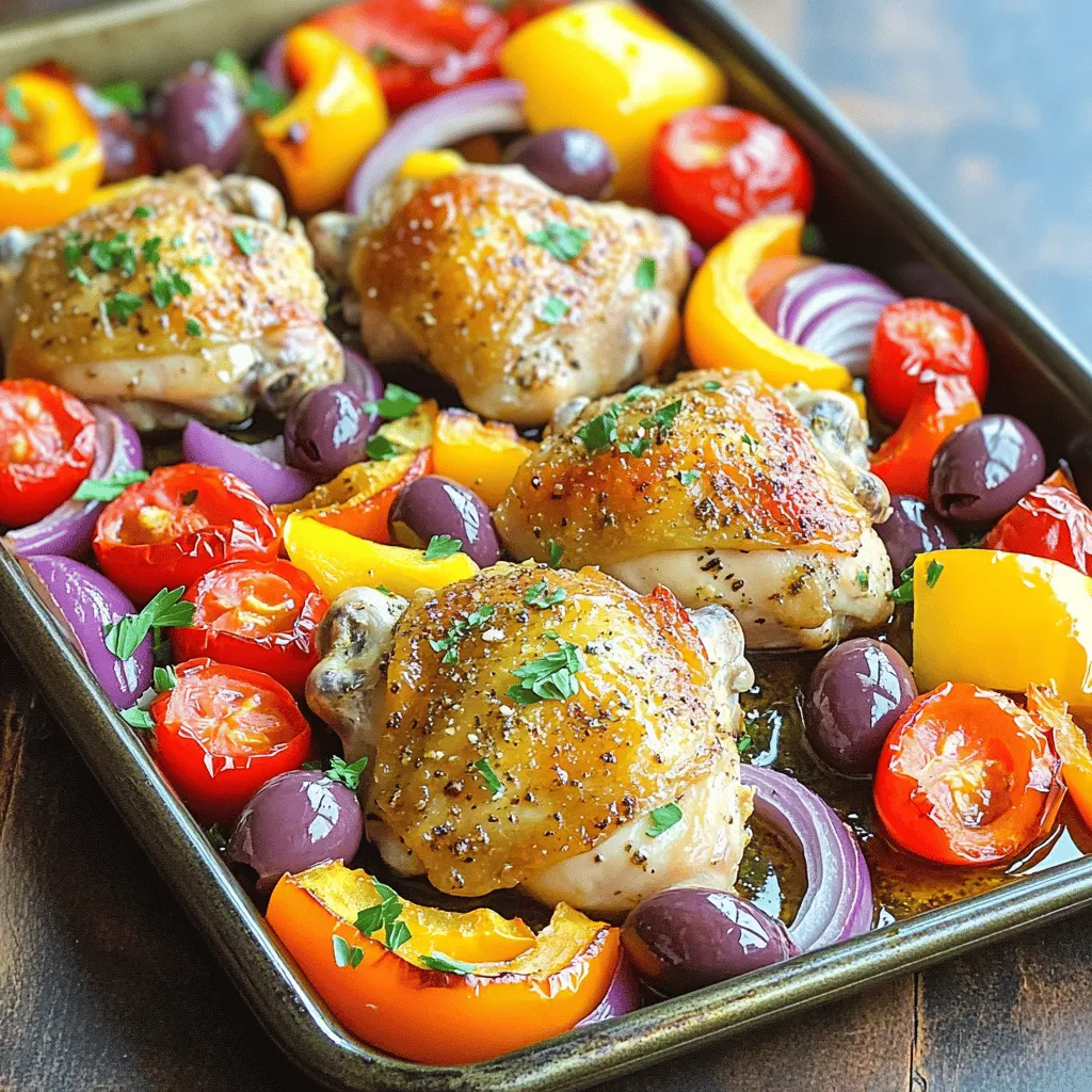 For this Greek Chicken Sheet Pan Dinner, you will need: - 4 boneless, skinless chicken thighs - 1 large red bell pepper, sliced - 1 large yellow bell pepper, sliced - 1 red onion, cut into wedges - 1 cup cherry tomatoes, halved - 1 cup kalamata olives, pitted and halved - 4 cloves garlic, minced - 1 tablespoon dried oregano - 1 tablespoon fresh lemon juice - 3 tablespoons olive oil - Salt and pepper to taste These ingredients come together to create a dish that bursts with flavor. The chicken thighs stay juicy while roasting alongside sweet and colorful vegetables. You can add a few optional items for extra flavor: - Feta cheese, crumbled - Fresh parsley for garnish Feta cheese adds a creamy, salty touch, while parsley brightens the dish. Both bring a nice finish to your meal. 1. Preheating the oven: Start by preheating your oven to 425°F (220°C). This step ensures your chicken cooks evenly and gets that nice golden color. 2. Making the marinade: In a large bowl, mix together olive oil, minced garlic, dried oregano, fresh lemon juice, salt, and pepper. This marinade packs a punch of flavor. You want to coat the chicken well for the best results. 1. Marinating the chicken: Add the chicken thighs to the marinade. Make sure each piece is well-covered. Let the chicken sit for at least 15 minutes. This waiting time allows the flavors to soak in. 2. Arranging ingredients on the sheet pan: While the chicken marinates, prepare your veggies. On a large sheet pan, arrange the sliced bell peppers, red onion wedges, cherry tomatoes, and halved kalamata olives. This colorful mix not only looks good but also adds great taste. 3. Baking in the oven: Place the marinated chicken thighs on top of the vegetables. Spread everything out evenly. Roast in the preheated oven for 25-30 minutes. The chicken should reach an internal temperature of 165°F (75°C) and the veggies will be tender and flavorful. 1. Resting the dish before serving: Once your meal is done baking, take it out and let it rest for about 5 minutes. This resting time helps keep the chicken juicy. 2. Garnishing options: Before serving, sprinkle fresh chopped parsley over the dish. If you like, add crumbled feta cheese for extra creaminess. Serve right from the pan for a rustic touch, letting everyone help themselves. For the best flavor, marinate the chicken for at least 15 minutes. If you have time, let it sit for 30 minutes or even overnight. This gives the chicken time to soak up the tasty marinade. You can enhance the flavor by adding herbs like thyme or rosemary. Fresh herbs offer a bright taste. To ensure even cooking, spread the chicken and veggies out well on the sheet pan. This allows hot air to move around each piece. Check the chicken doneness by using a meat thermometer. The safe internal temperature should reach 165°F (75°C). This keeps the meal safe and juicy. Serve the dish straight from the pan. This gives a rustic and warm feel. It allows everyone to help themselves. You can use fresh parsley to add a pop of color. If you like, sprinkle crumbled feta cheese on top. This adds a creamy texture and extra flavor. {{image_2}} You can swap chicken thighs for other proteins. Try using turkey, shrimp, or even pork. Each protein brings its own taste and texture. For a vegetarian option, replace the chicken with chickpeas or tofu. Both options soak up the marinade well and add protein to your meal. Seasonal vegetables can change your dish. Use zucchini, asparagus, or eggplant. These veggies add color and taste. You can also add spices like cumin or smoked paprika. They will enhance the flavor of your meal and make it even more exciting. Pair your Greek chicken with different sides. Rice, quinoa, or pita bread work great. They help soak up the tasty juices from the pan. To make this a meal prep option, divide the dish into containers. This way, you have easy meals ready for the week. To keep your Greek chicken sheet pan dinner fresh, use airtight containers. Glass or plastic containers work well. Store the chicken and veggies together or separately. This helps keep the chicken moist. Always let your food cool before sealing it. This prevents moisture build-up, which can make your food soggy. Aim to eat leftovers within three to four days. When reheating, you want to keep the chicken juicy. The oven is best for this. Preheat it to 350°F (175°C). Place the chicken and veggies on a baking tray. Cover them with foil to trap moisture. Heat for about 15-20 minutes until warm. The microwave is faster but can dry out food. If you use the microwave, add a splash of water. Cover the dish with a lid or wrap to keep steam in. Heat in short bursts, checking often. Freezing is a great option for longer storage. Let the dish cool completely before freezing. Use freezer-safe bags or containers. Squeeze out as much air as you can. This helps prevent freezer burn. To thaw, move the dish to the fridge overnight. This keeps the chicken safe. You can also use the microwave for quick thawing. Just remember to cook it right after thawing for food safety. Yes, you can use bone-in chicken thighs. They add rich flavor and moisture. However, they take longer to cook. Bone-in thighs usually need about 35-40 minutes at 425°F (220°C). Make sure to check the internal temperature with a meat thermometer. It should reach 165°F (75°C) for safety. The best way to check is by using a meat thermometer. Insert it into the thickest part of the chicken. The internal temperature should hit 165°F (75°C). This ensures the chicken is safe to eat. If you don’t have a thermometer, cut into the chicken. It should be white and juices should run clear. If you don’t have kalamata olives, try green olives or black olives. You could also use capers for a briny taste. Each option will change the flavor a bit, but it will still be tasty. For a milder flavor, use diced pickles. In this blog post, I covered a simple and tasty sheet pan chicken recipe. We explored main and opti