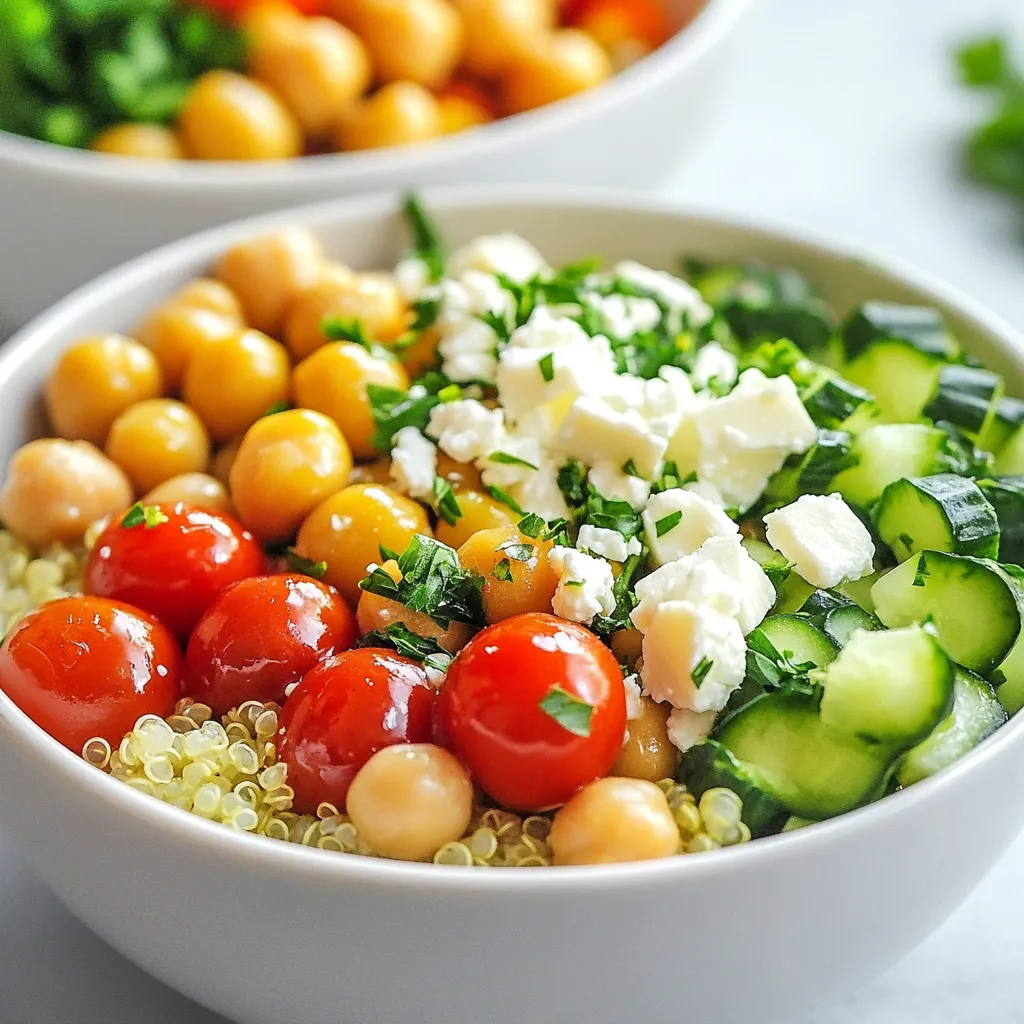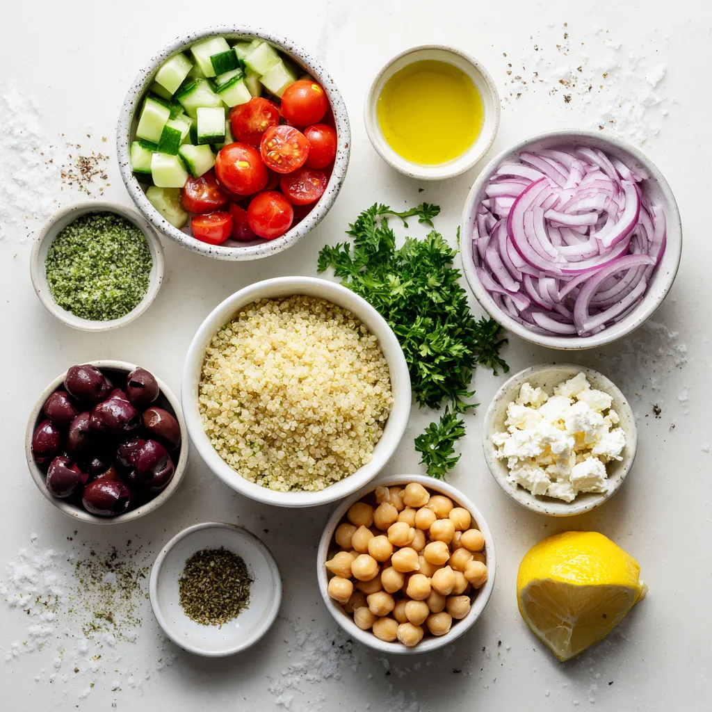 Quinoa is a star in these bowls. It is packed with protein and fiber. This grain helps keep you full. Cucumber adds crunch and hydration. Tomatoes provide vitamins A and C. Chickpeas boost protein and fiber as well. Red onion adds flavor and nutrients. Feta cheese gives a creamy touch and calcium. Kalamata olives offer healthy fats and a briny taste. Olive oil is full of good fats and helps with heart health. Lemon juice brightens the dish and adds vitamin C. Oregano brings a fresh herb taste and can aid digestion.