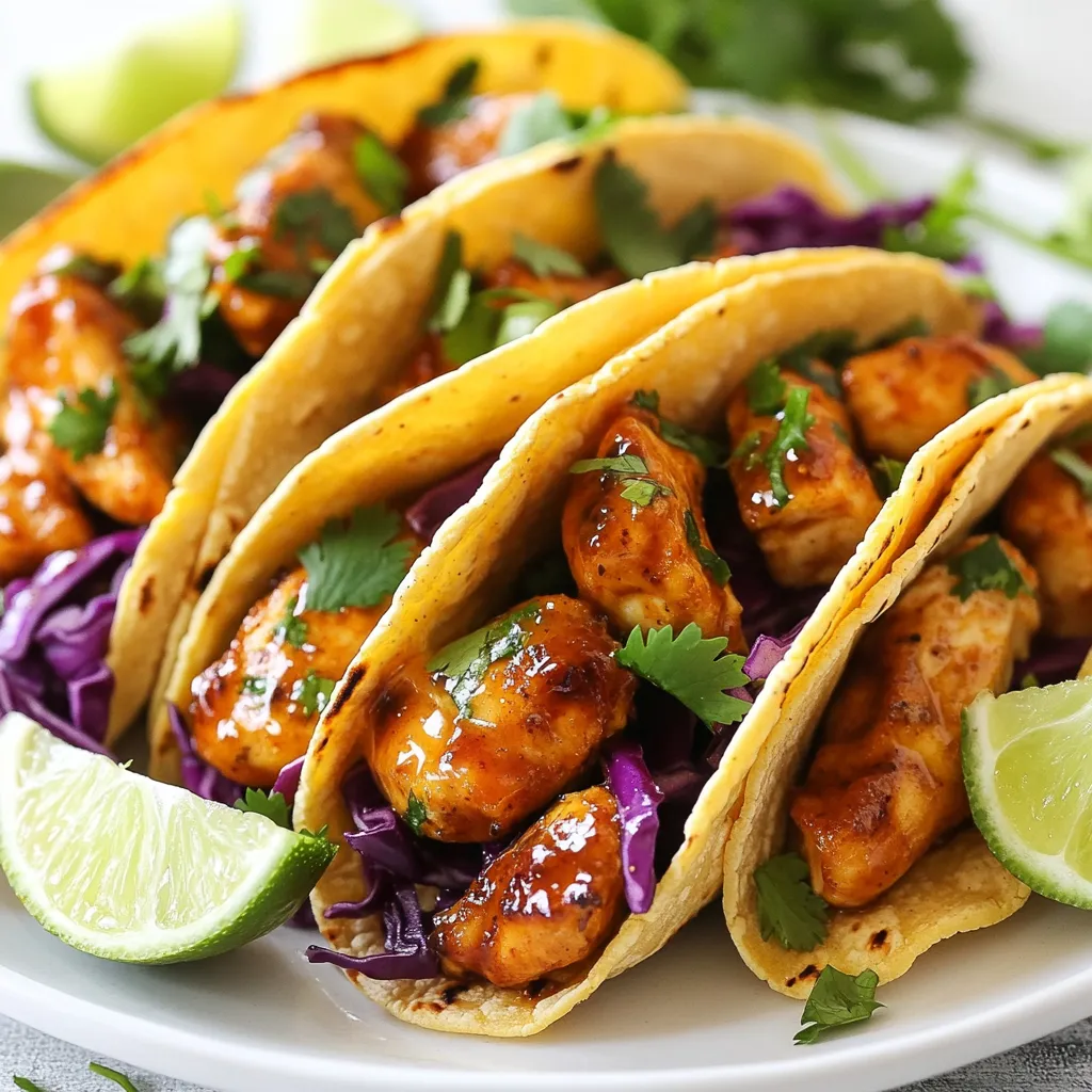 Once the chicken is cooked, take it off the heat. Let it rest for a couple of minutes. This keeps it juicy. Warm the corn tortillas in a separate dry skillet over low heat. Heat them for about 30 seconds on each side. Now, it’s time to build your tacos! Take a warm tortilla and add a spoonful of the honey chipotle chicken. Top it with shredded red cabbage, sliced avocado, and chopped cilantro. Squeeze fresh lime juice on top for a zesty kick. Enjoy your tasty tacos!