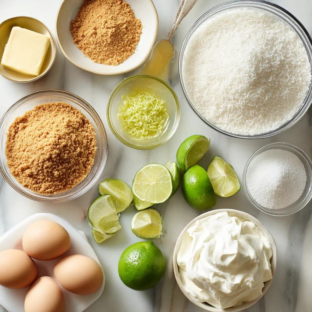 Delicious and tangy key lime pie bars with a coconut graham cracker crust.