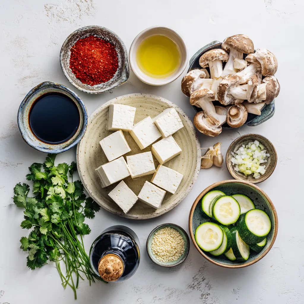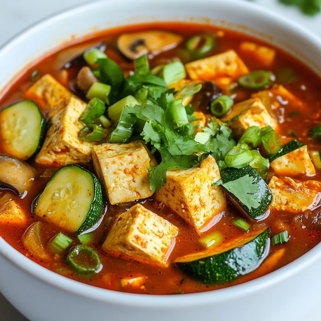 Tofu is the star of this stew. It gives a nice texture and protein. Firm tofu holds its shape well, making it perfect for stews. Zucchini adds softness and color. Mushrooms bring umami flavor and depth. The onion adds sweetness, while the green onions give a fresh finish.