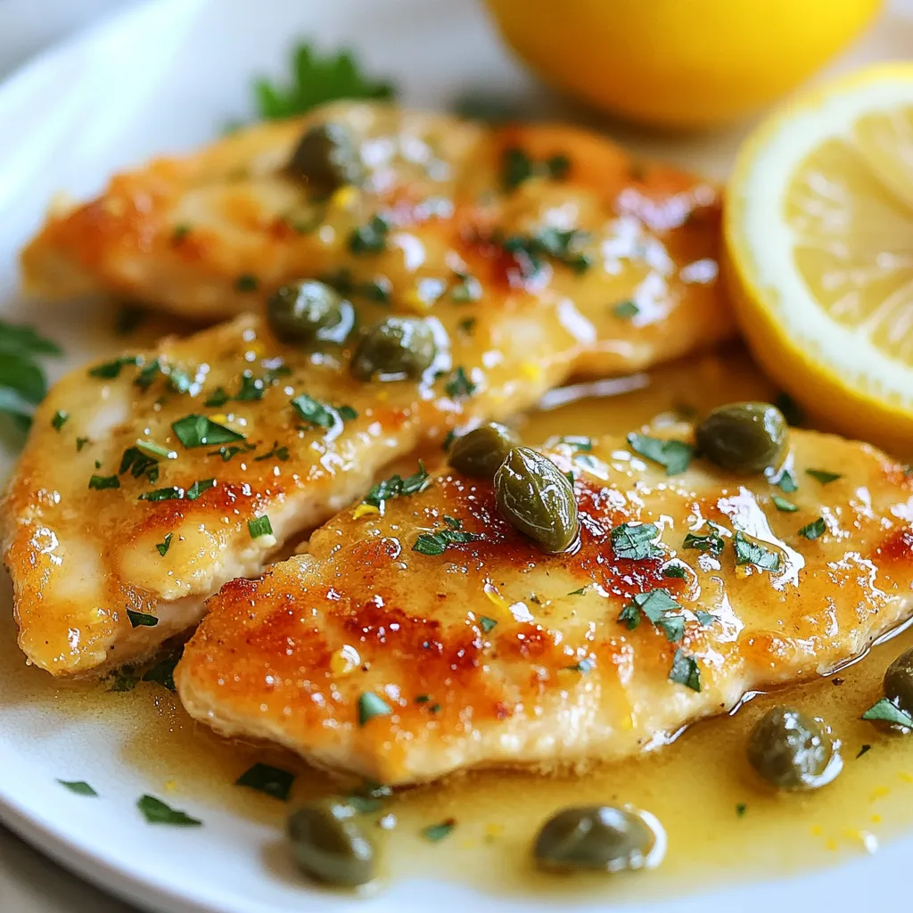 - 4 boneless, skinless chicken breasts - Salt and pepper to taste - 1/2 cup all-purpose flour - 4 tablespoons unsalted butter - 2 tablespoons olive oil The main ingredients create the base of this dish. Chicken breasts are the star, giving us a hearty protein. Salt and pepper add flavor, while flour helps to give the chicken a nice crust. Butter and olive oil work together to create a rich, flavorful cooking fat. - 3 cloves garlic, minced - 1 cup chicken broth (low-sodium) - 1 lemon (juice and zest) - 2 tablespoons capers, rinsed and drained - Fresh parsley, chopped (for garnish) These additional ingredients bring the dish to life. Garlic adds depth, while chicken broth gives moisture and flavor. The lemon juice and zest provide a bright, tangy note. Capers add a salty, briny touch, enhancing the overall taste. Fresh parsley and lemon slices make for a beautiful garnish, giving the dish that final touch. {{ingredient_image_1}} To start, you need to flatten the chicken breasts. Place each breast between two pieces of plastic wrap. Use a meat mallet and pound them until they are about 1/2 inch thick. This helps them cook evenly. Next, season both sides of the chicken with salt and pepper. Then, dredge each piece lightly in flour. Shake off any extra flour to avoid a heavy coating. This step adds a nice crust when you cook them. Now, it’s time to cook. In a large skillet, heat 2 tablespoons of butter and the olive oil over medium-high heat. Wait until the butter melts and gets bubbly. Add the chicken breasts to the skillet in a single layer. Cook them for about 4-5 minutes on each side. You want them golden brown and fully cooked. Once done, remove the chicken from the skillet and keep it warm on a plate. In the same skillet, add minced garlic. Sauté it for about 30 seconds until fragrant. This will add a wonderful flavor to your sauce. Carefully pour in the chicken broth, lemon juice, and lemon zest. Scrape the bottom of the pan to get all those tasty bits. Bring the mixture to a simmer. Stir in the rinsed capers and let the sauce cook for another 2-3 minutes. You want it to reduce and thicken slightly. Now, combine the chicken with the sauce. Reduce the heat to low, and return the chicken to the skillet. Spoon the sauce over the top of the chicken. Add the remaining 2 tablespoons of butter for a rich finish. Cook for one more minute to warm the chicken through. Make sure each piece is well-coated in the sauce. Finally, serve the chicken piccata right away. Garnish it with fresh parsley and extra lemon slices if you like. Enjoy this tasty meal! To cook chicken perfectly, you need to check the temperature. Use a meat thermometer. The chicken should reach 165°F (75°C) for safe eating. Cook the chicken for 4-5 minutes on each side. Look for a golden brown crust. That means it’s ready to flip. To avoid dry chicken breast, pound the chicken to even thickness. This helps it cook evenly. Also, don’t overcook it. Remove the chicken just when it reaches the right temperature. Let it rest for a couple of minutes before serving. This keeps it juicy. For better taste, try adjusting the seasoning. Add a pinch more salt or pepper if needed. You can also add a little garlic powder for extra flavor. Fresh ingredients always shine in this dish. Use fresh garlic and a ripe lemon for the best taste. Fresh parsley adds a nice touch too. It brightens up the plate and the flavor. Always choose quality ingredients to make your dish stand out. Pro Tips Flatten the Chicken Evenly: Make sure to pound the chicken breasts evenly to ensure they cook uniformly and stay juicy. Use Fresh Ingredients: Fresh lemon juice and zest will enhance the flavor of your piccata sauce significantly compared to bottled options. Don't Skip the Capers: Capers add a unique briny flavor that complements the lemon and chicken beautifully; don't leave them out! Garnish for Presentation: A sprinkle of fresh parsley and lemon slices not only adds color but also a fresh aroma to your dish. {{image_2}} To make Lemon Butter Chicken Piccata fit your needs, you can swap some ingredients. If you need a gluten-free option, use gluten-free flour for dredging the chicken. This choice keeps the dish tasty without the gluten. You can also add vegetables for a complete meal. Try adding fresh spinach or cherry tomatoes to the skillet when you cook the chicken. These veggies will soak up the sauce's great flavor and add color to your plate. Lemon Butter Chicken Piccata pairs well with many sides. Serve it over creamy mashed potatoes for a cozy meal. You can also try it with rice, which absorbs the lemon butter sauce nicely. For a fun twist, serve the chicken with pasta. Toss the pasta in the lemon butter sauce for extra zest. You can even use zucchini noodles for a lighter option. This way, you get a dish that's fresh and filling! To keep your Lemon Butter Chicken Piccata fresh, follow these tips: - Refrigeration: Store leftovers in an airtight container. Keep them in the fridge for up to three days. Make sure they cool down before sealing to prevent moisture build-up. - Freezing: For longer storage, freeze the chicken piccata. Place it in a freezer-safe container. It can last for up to three months. When ready to eat, thaw it in the fridge overnight before reheating. To enjoy your Lemon Butter Chicken Piccata again, use these methods: - Stovetop: Heat a skillet over low to medium heat. Add a splash of chicken broth or water to prevent sticking. Place the chicken in the skillet, cover, and heat until warm. - Microwave: Place the chicken on a microwave-safe plate. Add a few drops of water on top to keep it moist. Cover with a microwave-safe lid. Heat in short bursts, checking often to avoid overcooking. Following these steps ensures your Lemon Butter Chicken Piccata stays tasty and safe to eat! How do I make the sauce thicker? To thicken the sauce, you can use a few simple methods. One way is to add more flour. Mix a tablespoon of flour with a litt