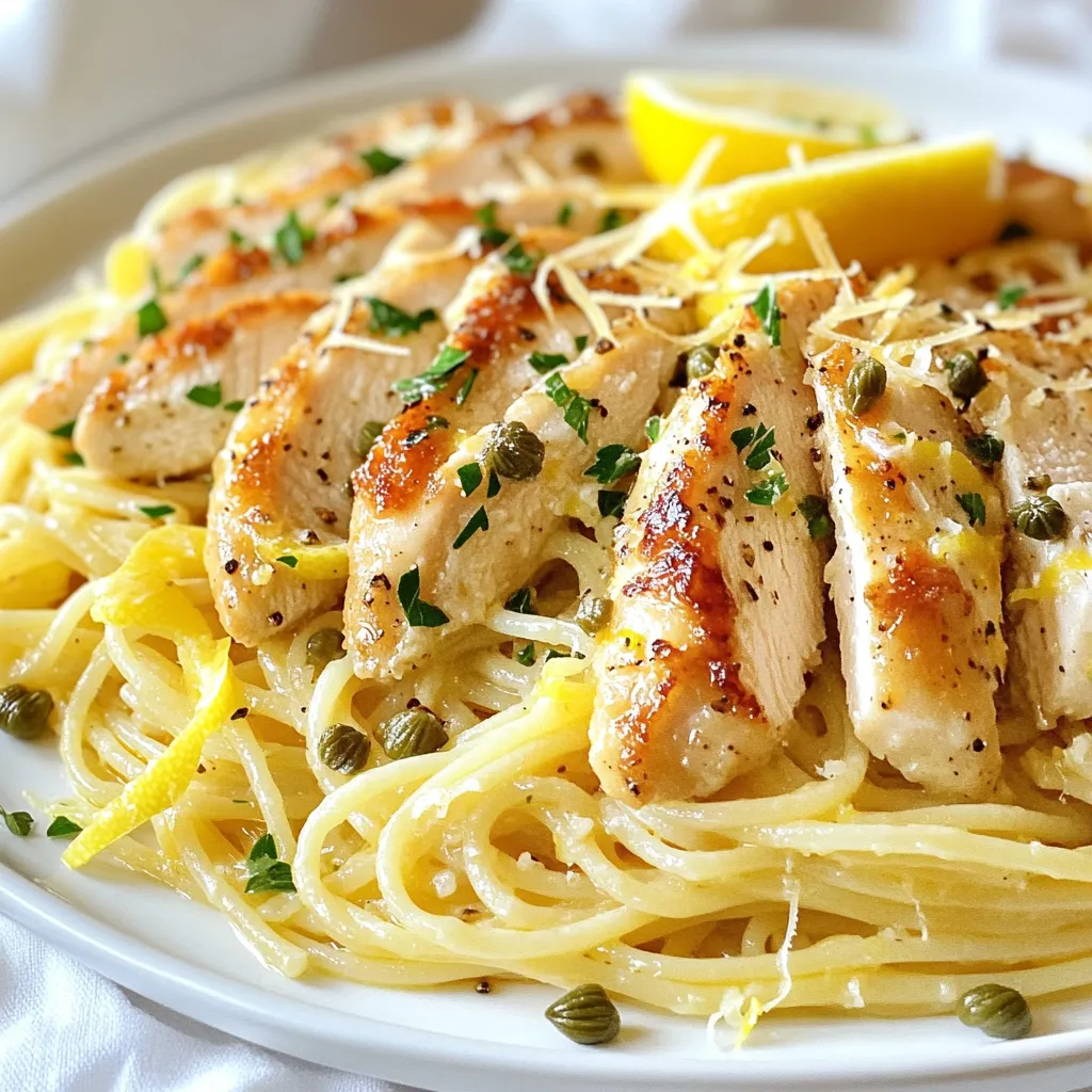 To make this tasty dish, gather these main ingredients: - 8 oz spaghetti or your choice of pasta - 2 boneless, skinless chicken breasts - Salt and pepper, to taste - 1/2 cup all-purpose flour (for dredging) - 3 tablespoons olive oil - 3 cloves garlic, minced - 1 1/2 cups chicken broth - 3 tablespoons capers, drained and rinsed - Juice of 1 lemon (about 3 tablespoons) - Zest of 1 lemon - 1/4 cup fresh parsley, chopped These ingredients come together to create a bright and flavorful dish. The capers and lemon juice give it a refreshing kick. You might want to add some optional ingredients for extra flavor: - Grated Parmesan cheese, for serving Parmesan adds a creamy touch. It complements the bright lemon and salty capers well. If you need substitutions, here are some ideas: - For gluten-free pasta, use rice or corn pasta. - Instead of chicken, you can use firm tofu or chickpeas for a vegetarian option. - You can swap capers for green olives if you prefer. These swaps allow you to enjoy this dish no matter your dietary needs. Each option keeps the essence of the recipe while adding a personal twist. {{ingredient_image_1}} Start by boiling salted water in a large pot. Add 8 oz of spaghetti or your choice of pasta. Cook the pasta until it is al dente, as per the package instructions. This usually takes about 8-10 minutes. Once done, drain the pasta and set it aside. Be sure to save a cup of the pasta water for later. While the pasta cooks, season 2 boneless, skinless chicken breasts with salt and pepper. Dredge each chicken breast in 1/2 cup of all-purpose flour, shaking off any extra. In a large skillet, heat 3 tablespoons of olive oil over medium heat. Add the chicken breasts and sear them for 5-7 minutes on each side. The chicken should turn golden brown and be fully cooked. Remove the chicken from the skillet and let it rest on a cutting board. In the same skillet, add 3 cloves of minced garlic. Sauté the garlic for about 30 seconds until it smells great. Next, pour in 1 1/2 cups of chicken broth, scraping up any tasty bits stuck on the bottom. Stir in 3 tablespoons of drained and rinsed capers, along with the juice and zest of 1 lemon. Allow this sauce to simmer for around 5 minutes, letting it thicken slightly. Return the cooked spaghetti to the skillet with the lemon-caper sauce. Toss everything together to coat the pasta well. If the sauce seems too thick, add some of the reserved pasta water to loosen it up. While the pasta is hot, slice the seared chicken into strips. Serve the pasta on plates, adding the sliced chicken on top. Finish with chopped parsley and, if you like, sprinkle some grated Parmesan cheese on top. Enjoy your meal! To make great pasta, start with a large pot. Bring salted water to a boil. Use about 1 tablespoon of salt for every 4 quarts of water. This helps flavor the pasta. Add your spaghetti and cook it until al dente. Check the package for timing. Remember, you can always taste it! After cooking, save a cup of pasta water. This starchy water can help your sauce stick later. The key to juicy chicken is to not overcook it. Start by seasoning the chicken with salt and pepper. Dredge it in flour, shaking off the extra. Heat olive oil in a skillet over medium heat. Sear the chicken for 5-7 minutes on each side. It should be golden brown and cooked through. Let the chicken rest on a cutting board before slicing. This keeps the juices locked in. To create a flavorful sauce, use the same skillet where you cooked the chicken. Sauté minced garlic in the leftover oil for just 30 seconds. Then, add chicken broth to deglaze the pan. This means scraping up the browned bits for extra flavor. Stir in capers, lemon juice, and lemon zest. Let it simmer for about 5 minutes until it thickens slightly. This sauce will bring your dish to life with bright, zesty flavors. Pro Tips Use Fresh Ingredients: Opt for fresh lemon juice and zest for the best flavor. Fresh capers also enhance the dish's taste significantly. Don't Overcook the Chicken: Ensure the chicken is cooked just until golden brown and no longer pink inside to keep it juicy and tender. Reserve Pasta Water: Always save a cup of pasta water before draining. It’s perfect for adjusting the sauce consistency without losing flavor. Garnish for Presentation: Fresh parsley and a sprinkle of Parmesan cheese not only add flavor but also enhance the visual appeal of the dish. {{image_2}} You can easily make this dish vegetarian. Replace the chicken with mushrooms or tofu. Use vegetable broth instead of chicken broth. This helps keep the flavor strong. For a vegan twist, skip the cheese or use a plant-based option. Adding vegetables makes this meal even better. Try spinach, cherry tomatoes, or bell peppers. You can sauté them before adding the sauce. This not only boosts nutrition but also adds color and flavor. Feel free to mix any veggies you like. You can change the herbs for new flavors. Basil or thyme work great with lemon and capers. Try adding dill for a fresh taste, too. Each herb brings its own twist. Have fun experimenting to find what you like best! To keep your Lemon Caper Chicken Piccata Pasta fresh, store it in an airtight container. Make sure to let it cool before sealing. This helps prevent condensation and sogginess. Place the container in the fridge. Leftovers last about three days. When you are ready to enjoy your pasta again, reheat it on the stove. Add a splash of chicken broth or water to help it warm up. Heat over medium-low heat, stirring gently until warm. You can also use the microwave. Place in a microwave-safe bowl. Cover it with a damp paper towel and heat in 30-second bursts until hot. If you want to freeze your Lemon Caper Chicken Piccata Pasta, do it before adding the chicken. Freeze the pasta and sauce in separate bags. This keeps the pasta from getting mushy. It can last up to three months in the freezer. To thaw, place it in the fridge overnight. Reheat on the stove or in the microwave. Enjoy 