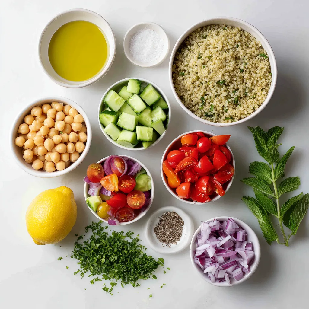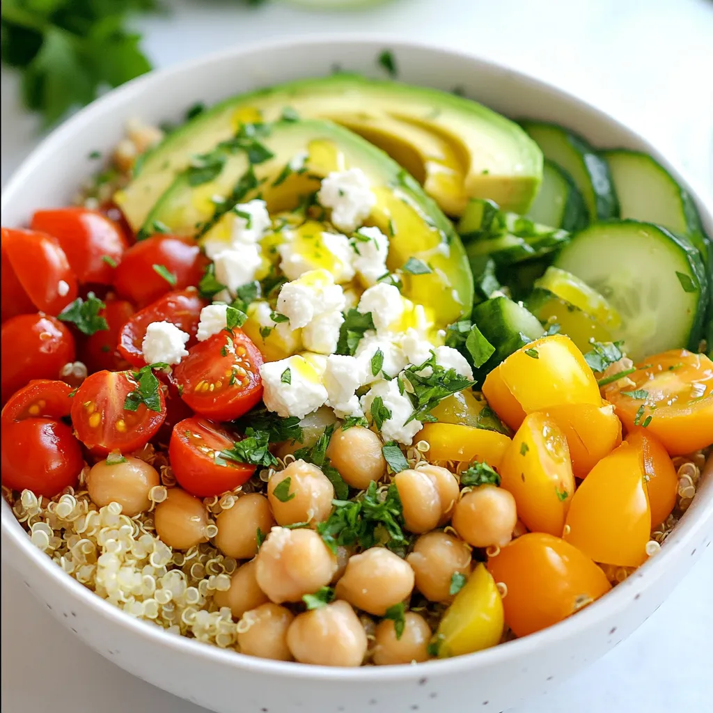 To make Lemon Herb Quinoa Bowls, gather these main ingredients: - 1 cup quinoa, rinsed - 2 cups vegetable broth or water - 1 cup cucumber, diced - 1 cup cherry tomatoes, halved - 1 bell pepper (red or yellow), diced - 1/2 red onion, finely chopped - 1 cup chickpeas, canned and rinsed - 1 avocado, sliced - 2 tablespoons fresh parsley, chopped - 2 tablespoons fresh mint, chopped - 3 tablespoons olive oil - Juice of 1 lemon - Salt and pepper to taste These ingredients create a fresh and zesty bowl that is both tasty and healthy. You can add some fun toppings to your quinoa bowls. Consider these options: - Feta cheese, crumbled - Extra herbs, like dill or cilantro - Sliced radishes for crunch - Toasted nuts or seeds for texture These toppings can elevate your dish and add a burst of flavor. You will need some common pantry items for this recipe. Here’s what to keep on hand: - Olive oil - Salt - Pepper - Vegetable broth or water Having these staples ready makes the cooking process easy and smooth. {{ingredient_image_1}} First, grab a medium saucepan. Pour in two cups of vegetable broth or water. Turn up the heat and wait for it to boil. Once it boils, add one cup of rinsed quinoa. Lower the heat and cover the pan. Let it simmer for about 15 minutes. You will know it is ready when the quinoa is fluffy and the liquid is gone. Take it off the heat and fluff it with a fork. Let it cool a bit before using it in your bowl. While the quinoa cooks, it's time to prep the veggies. Take a large mixing bowl. Dice one cup of cucumber and add it to the bowl. Next, halve one cup of cherry tomatoes and toss them in. Dice one bell pepper and add it too. Finely chop half a red onion and mix it in as well. Finally, drain and rinse one cup of chickpeas, then add them to the mix. Stir everything together so that the flavors blend. For the dressing, use a small bowl. Whisk together three tablespoons of olive oil and the juice of one lemon. Add salt and pepper to taste. Mix until it is well combined. If you want a stronger flavor, feel free to adjust the seasoning. This zesty dressing will tie all the ingredients together. To cook quinoa perfectly, rinse it well. This removes a bitter coating. Use two cups of liquid for every cup of quinoa. Bring the broth to a boil first. Add the quinoa, then lower the heat. Cover and let it simmer for about 15 minutes. Once done, fluff it with a fork. This gives you light and fluffy quinoa. You can easily change this recipe. Swap the vegetables based on your favorites. Try adding roasted zucchini or corn. You can also change the herbs. Basil or cilantro can add a new twist. If you prefer more protein, toss in grilled chicken or tofu. Adjust the lemon juice for more zing or less if you want. For added flavor, consider toasting the quinoa before cooking. This gives it a nutty taste. You can also sprinkle some nuts or seeds on top. Toasted almonds or pumpkin seeds add crunch. For presentation, use colorful bowls. Arrange your avocado and feta nicely on top. Fresh herbs not only taste great but also look lovely. Pro Tips Rinse Your Quinoa: Rinsing quinoa before cooking removes its natural coating, called saponin, which can make it taste bitter. Always rinse it under cold water for a few minutes to ensure a pleasant flavor. Chill for a Refreshing Taste: After cooking, let the quinoa cool completely in the refrigerator. This enhances the flavors and gives the bowl a refreshing touch, perfect for warm days. Mix It Up with Vegetables: Feel free to experiment with different vegetables like zucchini, carrots, or spinach. This not only adds variety to the dish but also boosts its nutritional value. Add a Protein Boost: For an extra protein kick, consider adding grilled chicken, shrimp, or tofu. This makes the quinoa bowl a complete meal, satisfying and nourishing. {{image_2}} You can add protein to your Lemon Herb Quinoa Bowls for a heartier meal. Here are some great options: - Grilled chicken breast, diced - Shrimp, sautéed in garlic - Tofu, cubed and pan-fried - Hard-boiled eggs, sliced - Lentils, cooked and seasoned These proteins add flavor and make the dish more filling. Choose what you like best! While the lemon dressing is zesty and fresh, you can mix it up! Here are some tasty alternatives: - Balsamic vinaigrette for a sweet touch - Tahini sauce for a nutty flavor - Yogurt dressing for creaminess - Spicy sriracha or chili oil for heat These dressings can change the flavor profile and bring new life to your bowls. Using seasonal ingredients can elevate your Lemon Herb Quinoa Bowls. Here are some swaps to consider: - In summer, add fresh corn or zucchini - In fall, try roasted butternut squash or sweet potatoes - In winter, use kale or Brussels sprouts - In spring, include asparagus or snap peas These seasonal swaps keep the dish fresh and exciting throughout the year! To keep your Lemon Herb Quinoa Bowls fresh, place leftovers in an airtight container. Let the dish cool to room temperature before sealing. Store it in the fridge for up to three days. If you want to enjoy it later, keep the toppings separate. This helps maintain their texture. Reheating quinoa bowls is easy. You can use a microwave or stovetop. For the microwave, place your bowl in for about one to two minutes. Stir halfway to heat evenly. If using a stovetop, add a splash of water in a pan. Heat over medium heat, stirring until warm. To freeze your quinoa bowls, portion them into freezer-safe containers. Make sure to leave some space at the top for expansion. They can last up to three months in the freezer. When ready to eat, let them thaw in the fridge overnight. Then, reheat as mentioned above. You can use rice instead of quinoa. Brown rice adds a nice chew. You can also try farro or barley. Both give a hearty texture. If you want something lighter, use cauliflower rice. It cooks fast and is low in carbs. Yes, this recipe is gluten-free. Quinoa is a seed, not a grain. This makes it safe for people with gluten iss