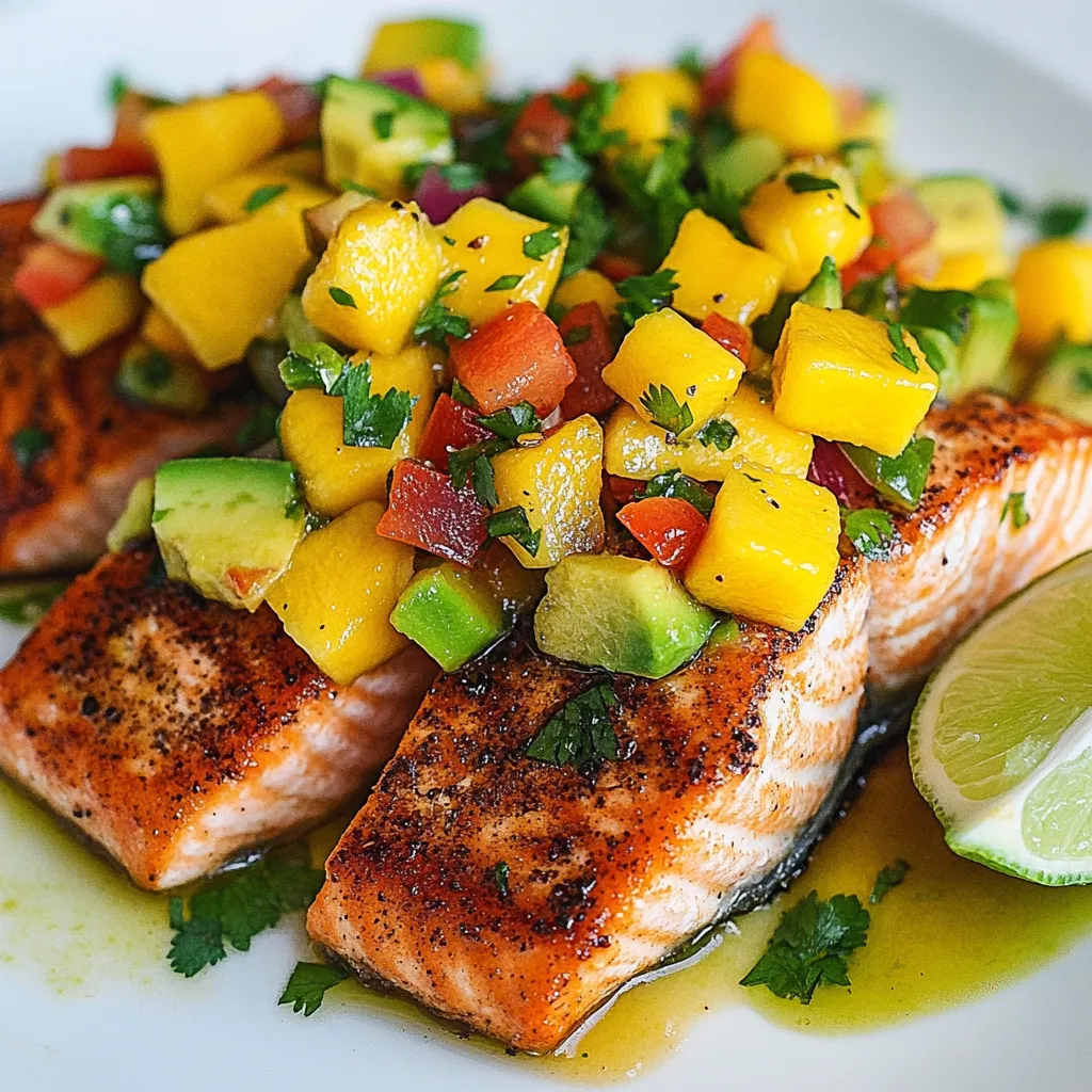 • Serve: Place the cooked salmon fillets on a serving plate and top generously with the mango avocado salsa.