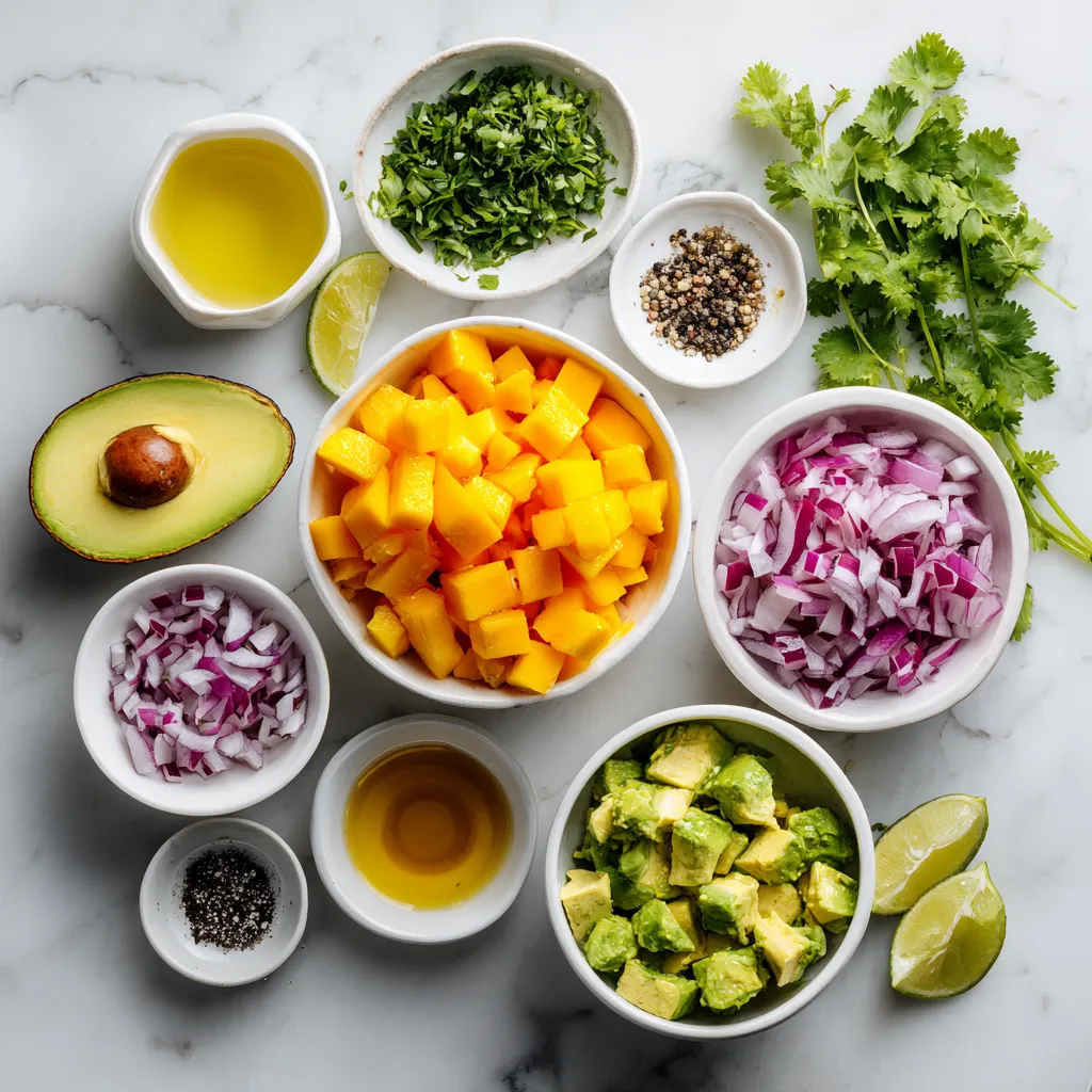 • Prepare the Mango Avocado Salsa: In a medium bowl, combine the diced mango, diced avocados, chopped red bell pepper, red onion, and jalapeño if using.