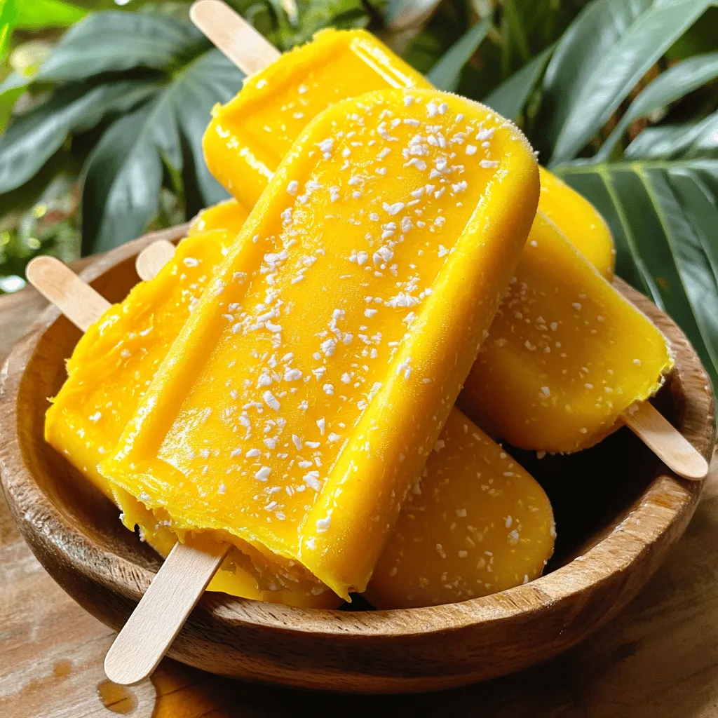 - 2 ripe mangoes, peeled and diced - 1 cup coconut milk (canned for creaminess) - 1 tablespoon honey or maple syrup (optional, depending on sweetness preference) - 1 tablespoon lime juice - 1/4 teaspoon vanilla extract - Pinch of salt For these popsicles, ripe mangoes are key. They give a sweet and juicy flavor. Use fresh mangoes for the best taste. Coconut milk adds a creamy texture. I recommend canned coconut milk for a richer taste. Honey or maple syrup can sweeten the mix, but it’s up to you. Lime juice balances the flavors and adds a zesty kick. A pinch of salt can enhance all the sweet notes. - Coconut flakes for garnish - Additional fruits for variations Coconut flakes make a fun garnish. They add texture and boost the tropical vibe. You can also mix in other fruits. Think strawberries or pineapple for a twist! You can find the full recipe linked above to explore all the tasty options. Start by peeling the mangoes. Use a sharp knife and cut off the skin. Next, dice the mangoes into small pieces. This helps them blend better. Measure out one cup of coconut milk. Use canned coconut milk for creaminess. Gather the other ingredients: honey or maple syrup, lime juice, vanilla extract, and a pinch of salt. Place all the ingredients in a blender. Blend until the mixture is smooth. This may take a minute or two. If you want it sweeter, taste the blend. You can add more honey or maple syrup. Blend again to mix in the sweetener. It should be creamy and delicious. Pour the mango-coconut mixture into popsicle molds. Leave a little space at the top. This allows the popsicles to expand. Insert popsicle sticks into each mold. Tap the molds gently on the counter. This removes air bubbles. Freeze the molds for 4 to 6 hours. Make sure they are completely solid before serving. For a detailed guide, check the Full Recipe. For creamy mango coconut popsicles, choose full-fat coconut milk. This type gives you a rich, smooth base. You can also use light coconut milk for a lighter treat. If you want more creaminess, add a bit of yogurt. Greek yogurt works well, adding both creaminess and protein. You can add a pinch of cinnamon or nutmeg for extra warmth. Fresh mint or basil also gives a nice twist. To balance the sweetness, add a splash of lime juice. Lime brightens the flavors and makes the popsicles taste fresh. Present your popsicles by placing them on a colorful plate. You can add a sprig of mint for a pop of color. For gatherings, serve them in a bowl with ice to keep them cold. Pair these popsicles with fresh fruit or a light cake for a fun treat. Check out the Full Recipe for more details on making these delicious popsicles! {{image_2}} You can add many fruits to your mango coconut popsicles. Berries like strawberries, blueberries, or raspberries work great. They add a pop of color and flavor. You can also use other tropical fruits, such as pineapple or passion fruit. Mixing fruits adds fun layers to your pops. Swirls of different purees look pretty, too. You can blend a berry puree and swirl it into your mango mixture. This adds visual appeal and a taste twist. Just pour a little puree into the molds before adding the mango mix. Swirl gently with a knife for a stunning effect. If you want a healthier treat, you can use alternative sweeteners. Try agave syrup or stevia instead of honey or maple syrup. These options can reduce sugar while keeping sweetness. You can also use unsweetened coconut milk. This helps cut calories and gives you a creamy texture without added sugar. Making these popsicles vegan is easy. Just be sure all your ingredients meet vegan standards. For example, use maple syrup instead of honey. You can also swap regular coconut milk for a plant-based milk. Almond or oat milk works well, too. Using these tips, you can create a mango coconut popsicle that fits your needs. For the full recipe, check out the delicious Tropical Bliss Mango Coconut Popsicles. To keep your mango coconut popsicles fresh, store them in airtight containers. This prevents freezer burn and keeps flavors intact. You can also wrap each popsicle in plastic wrap. This extra layer helps seal in moisture. Make sure the containers are clean before use. Label the containers with the date. This way, you won't forget when you made them. These popsicles can last up to two months in the freezer. After that, they may lose flavor and texture. Signs of spoilage include ice crystals forming on the surface or an off smell. If you notice these signs, it's best to toss them out. Always check your popsicles before enjoying them. Cleaning your popsicle molds is simple. Wash them with warm, soapy water after each use. Rinse well to remove any soap. You can use leftover popsicle bases in new flavors. Try mixing them with yogurt or fruit juice for a fun twist. This way, you can enjoy different treats while reducing waste. Yes, you can use frozen mangoes. They will blend well and create a nice texture. Just let them thaw for a few minutes. This helps the blender work better. The flavor stays sweet and fruity, just like fresh mangoes. You can add more honey or maple syrup. Start with one tablespoon, then taste the mix. If you want it sweeter, add more a little at a time. Blend briefly to mix in the extra sweetener. This way, you control how sweet your popsicles are. If you don’t have coconut milk, use almond milk or soy milk. These will change the flavor a bit. You can also try oat milk for a creamier texture. Just pick a milk that you like best. Yes, you can make sugar-free popsicles. Use ripe mangoes for natural sweetness. Avoid adding honey or syrup. You can use a sugar substitute like stevia if you want. This way, you enjoy the popsicles without extra sugar. To prevent sticking, run warm water over the mold outside. This helps loosen the popsicles. You can also let them sit at room temp for a minute. Gently pull on the sticks to release them. Enjoy your popsicles right after! Making mango coconut popsicles is fun and easy. We 