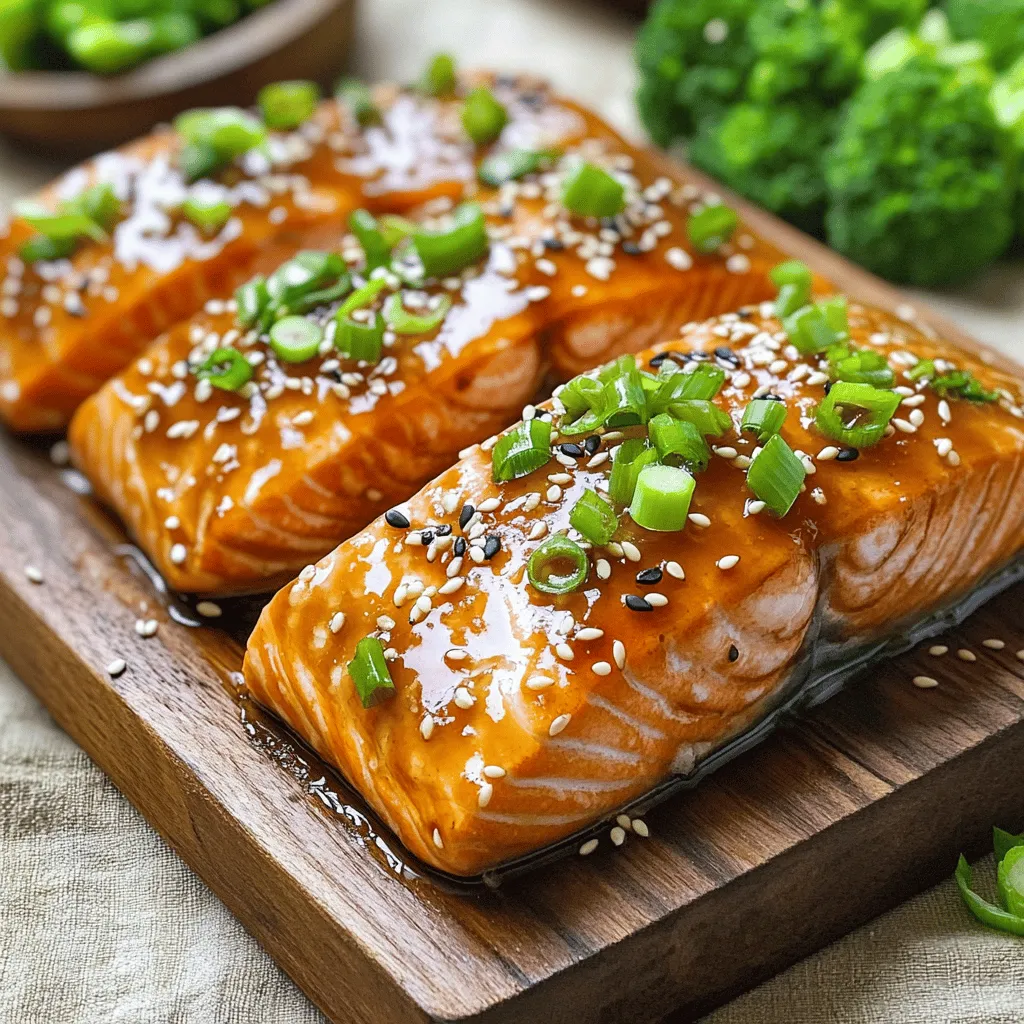 To make maple glazed salmon, you need key ingredients. Here’s what you’ll need: - 4 salmon fillets (skin-on or skinless) - 1/4 cup pure maple syrup - 2 tablespoons soy sauce (or tamari for gluten-free) - 2 cloves garlic, minced - 1 tablespoon Dijon mustard - 1 teaspoon ground ginger - Salt and pepper to taste - 2 tablespoons olive oil These items come together to create a sweet and savory glaze that enhances the salmon's natural flavor. Each ingredient plays a role, so using the right ones is vital. You can add more to your dish with garnishes and sides. I like to use: - Chopped green onions - Sesame seeds These toppings add color and crunch. For sides, consider serving steamed broccoli or quinoa. They pair well and create a balanced meal. When picking salmon, freshness is key. Look for these signs: - Bright, clear eyes - Shiny skin with no discoloration - A fresh ocean smell, not fishy Buying from a trusted source helps ensure quality. Fresh salmon makes all the difference in your dish. To start, gather all the marinade ingredients. You need pure maple syrup, soy sauce, minced garlic, Dijon mustard, ground ginger, salt, and pepper. In a small bowl, whisk together these ingredients until they blend well. This mix serves as both your marinade and glaze. The maple syrup adds sweetness, while soy sauce gives it a savory kick. Garlic and ginger bring in a nice depth of flavor. Now, take your salmon fillets. Place them in a shallow dish. Pour half of the marinade over the salmon. Use a spoon to spread it evenly. This step is key. It helps the salmon soak in all those lovely flavors. Let the fillets marinate for 15 to 30 minutes at room temperature. This short wait makes a big difference in taste. Next, preheat your oven to 400°F (200°C). While that heats up, grab a large oven-safe skillet. Add olive oil and heat it on medium-high. Once hot, carefully place the marinated salmon fillets in the skillet, skin-side down. Sear them for 2 to 3 minutes. You want the skin to get crispy. After that, flip the fillets over gently. Brush them with the remaining marinade. Now, transfer the skillet to the oven and bake for 8 to 10 minutes. The salmon is done when it flakes easily with a fork. After cooking, let the salmon rest for 2 to 3 minutes. This helps keep it juicy. To get the best glaze, use pure maple syrup. It gives a rich taste. Mix it with soy sauce, minced garlic, Dijon mustard, and ground ginger. This blend adds depth and layers of flavor. Make sure to coat the salmon well. Let it marinate for at least 15 minutes. This step helps the flavors soak in. When cooking, brush the salmon with extra glaze. This helps create that lovely shine. One common mistake is not marinating long enough. If you rush, the salmon won’t absorb the flavors. Another mistake is cooking at too high a heat. This can burn the glaze. You want a nice sear, not charred bits. Also, avoid flipping the salmon too soon. Wait until the skin is crispy. Lastly, don’t skip resting the salmon after cooking. This helps keep it moist. Maple glazed salmon pairs well with many sides. Try steamed broccoli for a pop of color and nutrition. Quinoa is another great choice. It adds a nice texture and is filling. For a fresh touch, serve with a simple salad. You can top the salmon with chopped green onions and sesame seeds. This adds flavor and makes the dish look nice. Enjoy your meal! {{image_2}} If you want a gluten-free dish, use tamari instead of soy sauce. Tamari gives the same rich flavor without gluten. Check labels on your maple syrup and other sauces to ensure they are gluten-free. This small swap keeps the meal safe and tasty for everyone. For those who love heat, add red pepper flakes or sriracha to the glaze. Start with a pinch of red pepper flakes and adjust to your taste. This adds a nice kick to the sweet maple flavor. Mix it into the marinade before you marinate the salmon. This spicy twist will surprise and delight your taste buds! You can use other proteins like chicken or tofu. Just adjust the cooking time if you switch to chicken. Tofu works great for a plant-based meal. For vegetables, try Brussels sprouts or asparagus. Toss them in the marinade and roast alongside the salmon. This keeps your meal fresh and exciting with new flavors! I love saving leftovers. To store your salmon, let it cool to room temp. Then, wrap it in plastic wrap or place it in an airtight container. This keeps it fresh. You can store it in the fridge for up to three days. For best taste, eat it within one or two days. Reheating is easy. You can use the oven or microwave. For the oven, preheat it to 350°F (175°C). Place the salmon on a baking sheet and cover it with foil. Heat for about 10 minutes. If using the microwave, place the salmon on a microwave-safe plate. Heat it in short bursts, around 30 seconds at a time, until warm. Be careful not to overcook it. Freezing is a great option if you want to keep your salmon longer. To freeze, wrap each fillet tightly in plastic wrap and then in foil. This helps avoid freezer burn. Store the wrapped salmon in a freezer bag. You can freeze it for up to three months. To thaw, put the salmon in the fridge overnight. Cook it as you normally would after thawing. Yes, you can use other fish for this recipe. Some good options are trout, tilapia, or cod. These fish can soak up the glaze well. Each fish has a unique taste, but they will still be delicious. You should marinate the salmon for 15 to 30 minutes. This time allows the flavors to soak in. If you leave it too long, the fish may become too salty. Keep an eye on it for best results. You can serve maple glazed salmon with many sides. Steamed broccoli is a great choice. Quinoa adds a nice touch, too. You may also want to try rice or a fresh salad. They all pair well with the sweet glaze. Maple glazed salmon is easy and tasty, as this guide shows. We covered the key ingredients, marinating tips, and cooking methods to create the perfect glaze. Don't fo