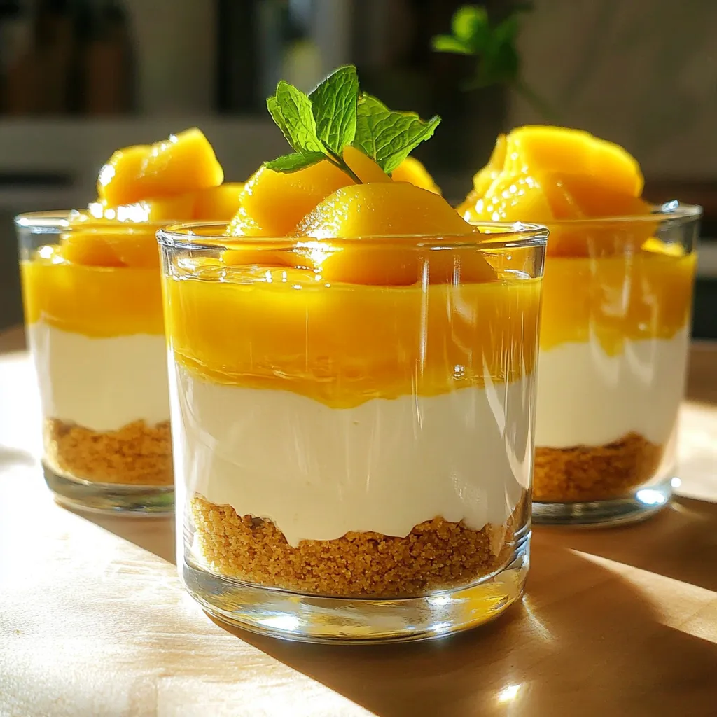 Now it’s time to fill the cups! Spoon the mango cheesecake filling over the crusts you made earlier. Make sure each cup gets an even amount. After that, place all the cups in the fridge. Chill them for at least four hours. This helps the filling set and makes it easier to eat later. Once they are set, garnish with fresh mango slices and mint leaves for a lovely touch. Enjoy your delicious creation!