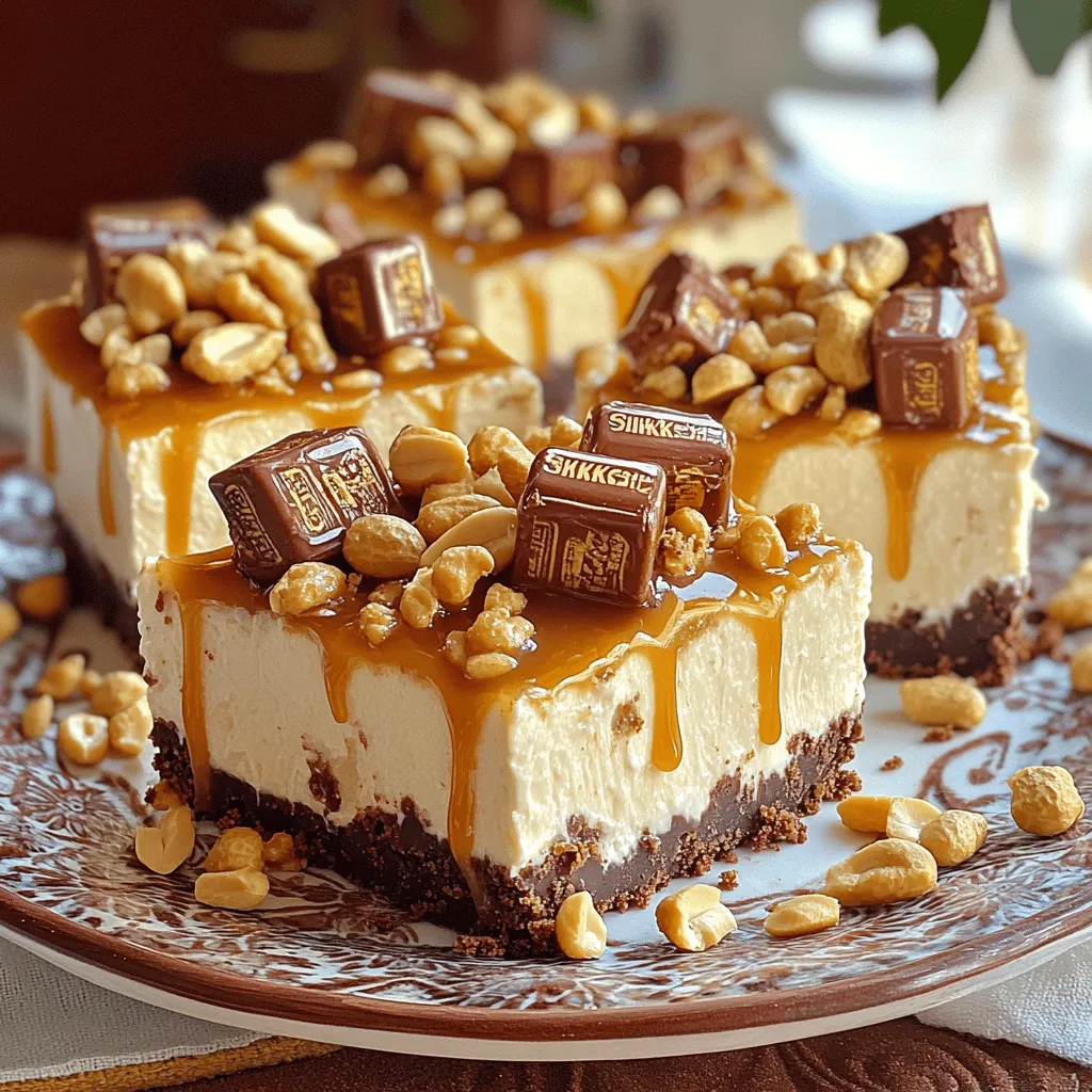 - 1 cup graham cracker crumbs - 1/4 cup unsweetened cocoa powder - 1/3 cup melted butter - 1 cup cream cheese, softened - 1 cup powdered sugar - 1 teaspoon vanilla extract - 1 cup heavy whipping cream - 4 fun-size Snickers bars, chopped - 1/4 cup caramel sauce - 1/4 cup chopped peanuts For the crust of these cheesecake bars, I use graham cracker crumbs. They bring a sweet crunch. I mix them with cocoa powder and melted butter for extra flavor. This gives the base a rich chocolate taste. Next, I whip up the filling. Cream cheese is key here. It makes the bars creamy and smooth. I blend it with powdered sugar and vanilla extract. This mix adds sweetness and a nice aroma. Heavy whipping cream is my secret to lightness. I whip it until stiff peaks form. Then, I gently fold it into the cream cheese mix. This step is vital. It keeps the filling airy. Finally, I add chopped Snickers and caramel sauce. The Snickers add bites of chocolate and nougat, while the caramel brings sweetness. I also toss in chopped peanuts for a delightful crunch. - Additional Snickers bars - Extra caramel sauce When serving, you can add more Snickers on top. It makes for a fun look and adds even more flavor. A drizzle of extra caramel sauce gives a sweet finish. It looks pretty and tastes amazing. - 8x8 inch baking dish - Mixing bowls - Hand mixer To make these bars, you need an 8x8 inch baking dish. This size is perfect for setting the cheesecake. Mixing bowls help keep everything organized. A hand mixer is essential for beating the cream cheese and whipping the cream. With these tools, you can create your tasty dessert with ease. To start, gather your graham cracker crumbs, cocoa powder, and melted butter. In a mixing bowl, combine these three ingredients. Mix until the crumbs get wet and look like sand. Next, take an 8x8 inch baking dish and line it with parchment paper. Press the crumb mixture firmly into the bottom of the dish. Make sure it is even. This crust needs to chill in the fridge for 15 minutes to set. Now, let’s make the filling. First, take your softened cream cheese and place it in a clean bowl. Beat it with a hand mixer until it becomes smooth. Gradually add in powdered sugar and vanilla extract. Mix until everything is well combined. In another bowl, whip the heavy cream until you see stiff peaks. This means the cream holds its shape well. Gently fold the whipped cream into the cream cheese mixture. Be careful not to deflate the whipped cream. It’s time to bring everything together! Fold in the chopped Snickers bars and caramel sauce into the cheesecake filling. This adds great flavor and texture. Now, pour the cheesecake filling over the chilled crust. Spread it evenly, and smooth the top with a spatula. Make sure it looks nice and neat. Then, refrigerate the cheesecake bars for at least 4 hours. When it has set, you can lift it out of the pan using the parchment paper. Cut into bars and enjoy! To ensure your crust is firm and set, always press it down tightly. Use a flat-bottomed measuring cup to pack the crumb mixture evenly. Refrigerate it for at least 15 minutes. This step helps create a sturdy base for your cheesecake. To prevent sticking, line the baking dish with parchment paper. Leave some paper hanging over the sides. This makes it easy to lift the bars out later. If you don’t have parchment, grease the dish well with butter or cooking spray. Achieving the right cheesecake texture is key. Start with softened cream cheese. This helps it blend smoothly. Mix it well with powdered sugar and vanilla until creamy. When whipping the heavy cream, use a clean bowl and beaters. This ensures you get stiff peaks. Fold the whipped cream into the cream cheese gently. Use a spatula and a light hand to keep the mixture airy and fluffy. For the best way to cut and serve the bars, use a sharp knife. Dip it in hot water before slicing. This helps create clean cuts. Make sure to wipe the knife after each cut for neat slices. Get creative with garnishing! Drizzle extra caramel over the top before serving. Add some chopped Snickers bits for a fun touch. You can also sprinkle chopped peanuts for crunch. Serve the bars on a colorful platter for a beautiful presentation. {{image_2}} You can easily change the flavor of these cheesecake bars. Try using different types of chocolate. Dark chocolate gives a rich taste, while milk chocolate is sweet and creamy. You can also use white chocolate for a smooth, mellow flavor. Adding peanut butter or butterscotch can boost the taste. Mix in some peanut butter for a nutty twist. Butterscotch adds a sweet, caramel-like flavor that pairs well with cheesecake. These small changes can make a big difference. If you want to make a healthier version, consider substituting graham crackers. You can use gluten-free options like almond flour or coconut flour. These swaps keep the crust delicious and gluten-free. Another idea is to use low-fat cream cheese. This reduces calories while keeping the creamy texture. You can also use natural sweeteners like honey or maple syrup. This way, you enjoy tasty bars with fewer added sugars. Incorporating seasonal fruits can add freshness to your bars. Berries like strawberries, blueberries, or raspberries work great. They add color and a tart taste that balances the sweetness. For themed decorations, you can change them with the seasons. Use sprinkles for a birthday or festive colors for holidays. This adds fun and excitement to your dessert, making it more appealing for any occasion. To keep your No-Bake Snickers Cheesecake Bars fresh and tasty, store them in the refrigerator. Use an airtight container to prevent them from absorbing any odors. If you want to keep them longer, you can freeze them. Wrap the bars tightly in plastic wrap, then place them in a freezer-safe container or bag. This double wrap helps avoid freezer burn. When stored in the fridge, these cheesecake bars last about 5 days. If you freeze them, they can stay good for up to 