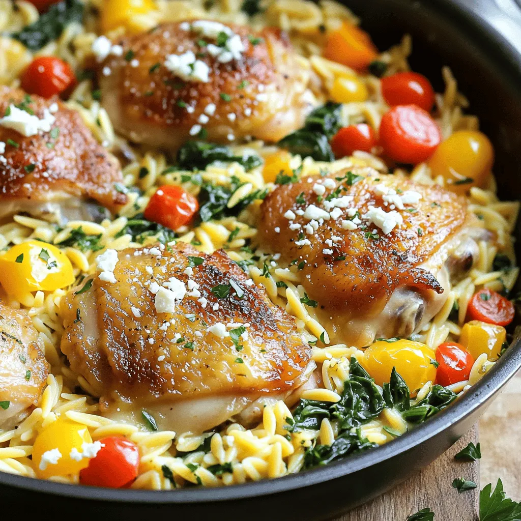 Each ingredient adds its own flavor and texture. The olive oil gives a rich base, while the chicken thighs stay juicy as they cook. The lemon zest and juice bring brightness to the dish. The bell pepper and red onion add sweetness and crunch, and the garlic enhances the aroma. Orzo pasta absorbs all the broth’s flavor, making it delightful. Cherry tomatoes burst with freshness, and spinach wilts perfectly for added greens. Finally, feta cheese adds creaminess, while parsley garnishes your dish beautifully.