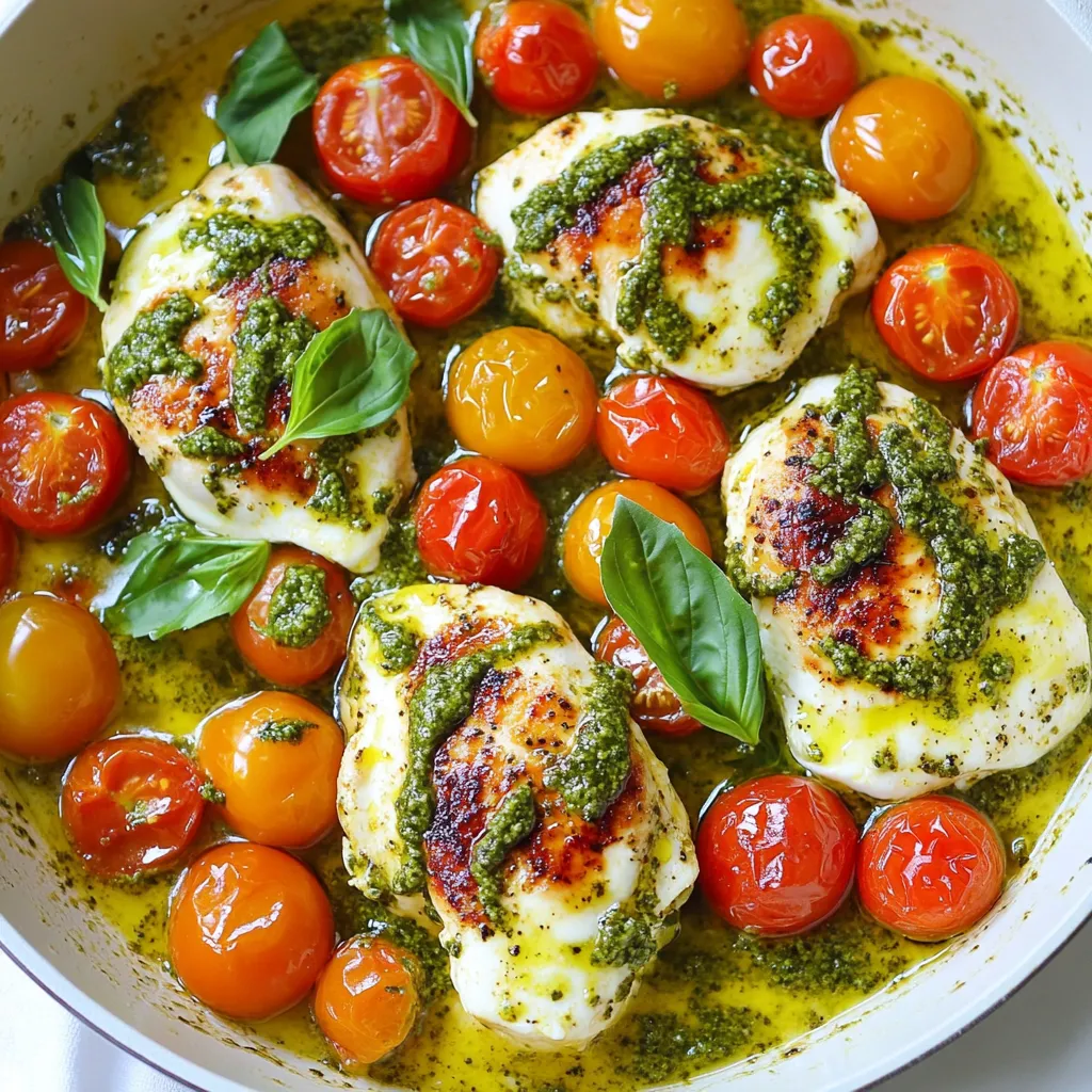 A delicious skillet dish featuring chicken breasts topped with fresh basil pesto, cherry tomatoes, and mozzarella.