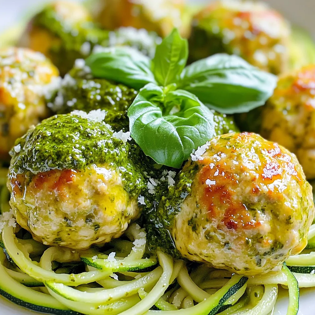 Serve your meatballs on a bed of zucchini noodles or pasta. This adds a nice touch and complements the flavors. Drizzle extra pesto on top for added taste. A sprinkle of fresh basil and Parmesan cheese enhances the look and flavor. For a side dish, consider a simple salad or roasted vegetables. These keep the meal light and fresh.