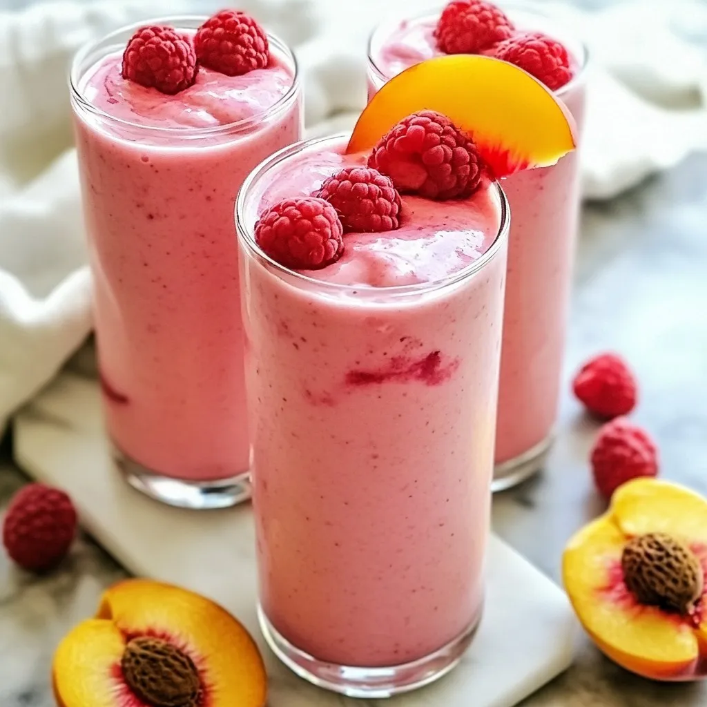 A refreshing and creamy smoothie made with raspberries, peaches, and banana, perfect for a healthy breakfast or snack.
