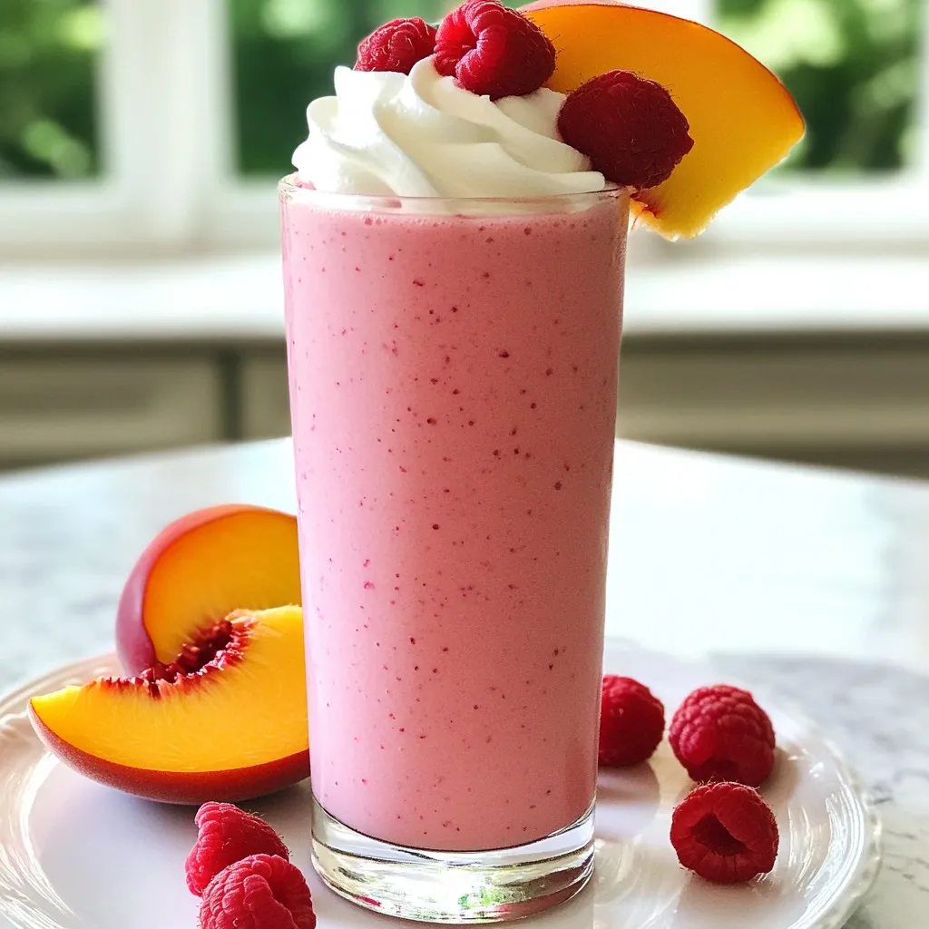 A refreshing and creamy smoothie combining the flavors of raspberries and peaches.