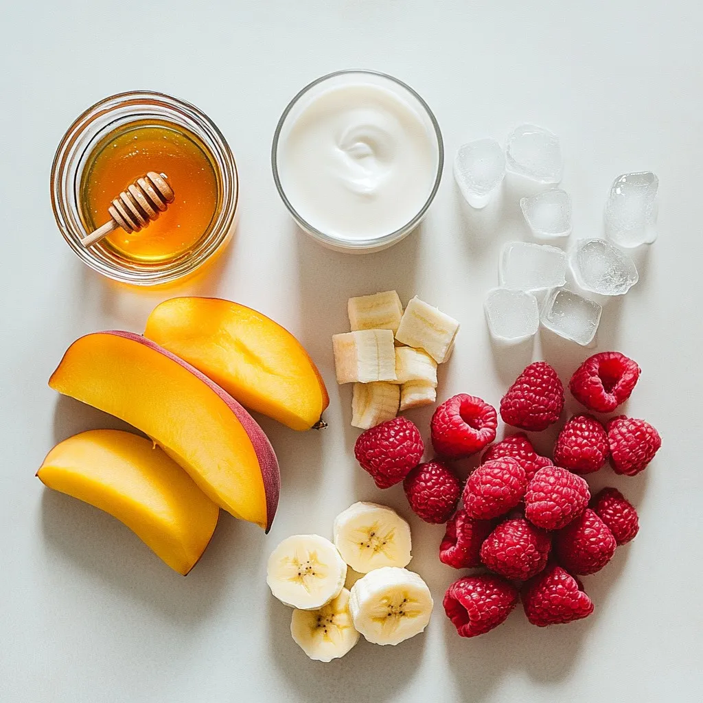 – Gather all ingredients. You will need fresh raspberries, a ripe peach, a banana, almond milk, honey or maple syrup, Greek yogurt, vanilla extract, and ice cubes if you want it thicker.
