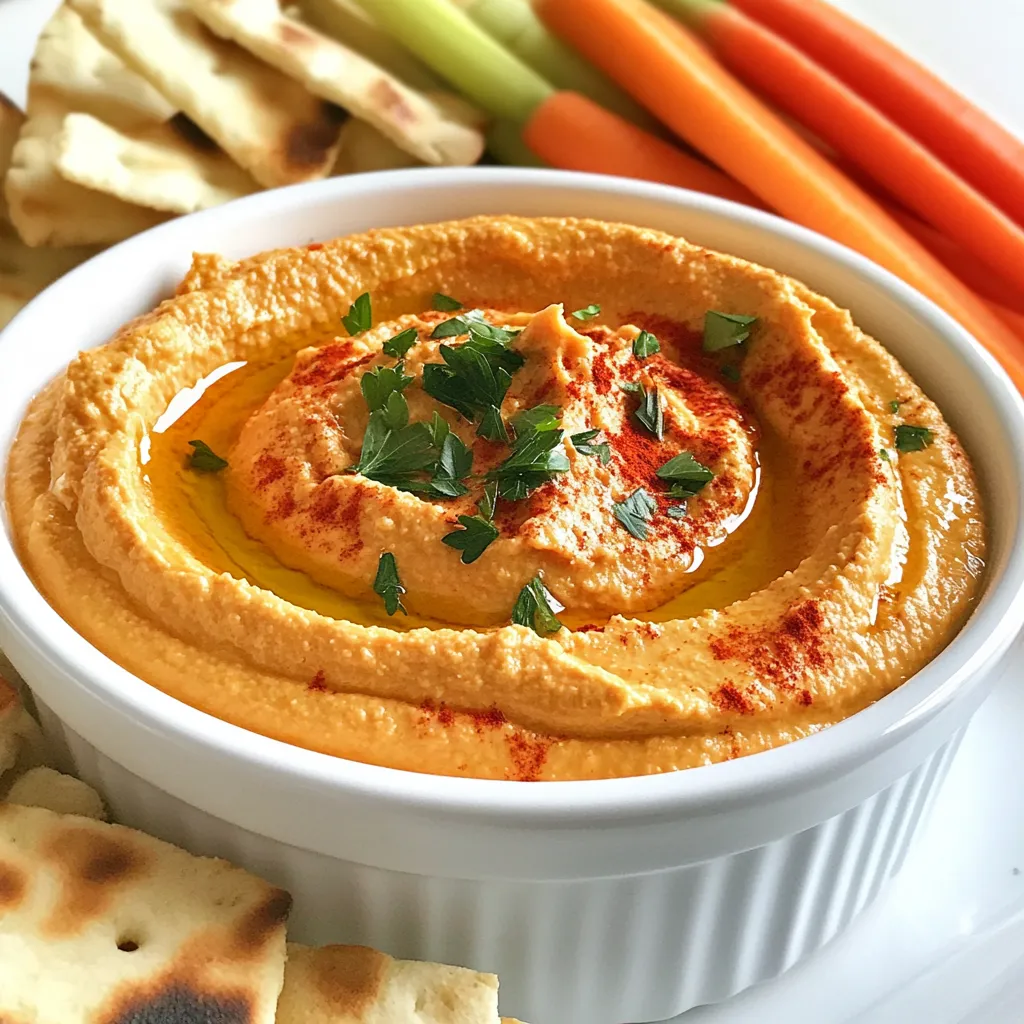 A creamy and flavorful hummus made with roasted red peppers and chickpeas, perfect for dipping.