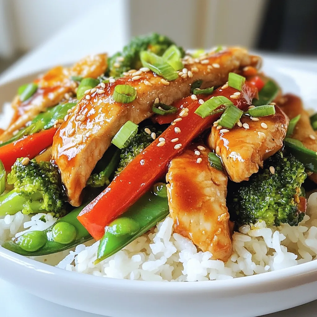 - Chicken Breast: You need 1 pound of chicken breast. Slice it thinly for quick cooking. Chicken adds protein and flavor to your dish. - Vegetables: Use 1 cup of broccoli florets, 1 sliced red bell pepper, and 1 cup of snap peas. These veggies bring color and crunch. They also add vitamins and minerals. - Sauces and Flavorings: You will use 3 tablespoons of low-sodium soy sauce and 1 tablespoon of rice vinegar. Add 2 tablespoons of sesame seeds, 3 cloves of minced garlic, and 1 tablespoon of grated fresh ginger for a punch of flavor. - Cooking Oil: Use 2 tablespoons of sesame oil. This oil gives a rich, nutty taste to your stir fry. - Rice or Noodles for Serving: Have cooked rice or noodles ready. They serve as a base for your stir fry. Enjoy your meal over a fluffy bed of rice or twirled noodles. {{ingredient_image_1}} Preparing Ingredients First, gather all your ingredients. You will need: - 1 lb chicken breast, thinly sliced - 2 tablespoons sesame oil - 1 cup broccoli florets - 1 red bell pepper, sliced - 1 cup snap peas - 3 cloves garlic, minced - 1 tablespoon fresh ginger, grated - 3 tablespoons soy sauce (low sodium) - 1 tablespoon rice vinegar - 2 tablespoons sesame seeds - 2 green onions, sliced - Cooked rice or noodles for serving Make sure to wash and chop the vegetables. This step helps add flavor and color. Marinating Chicken You can marinate the chicken for extra flavor. Mix soy sauce, rice vinegar, garlic, and ginger. Place the sliced chicken in a bowl and add the marinade. Let it sit for about 15 minutes. This process makes the chicken juicy and tasty. Heating the Skillet Heat a large skillet or wok over medium-high heat. Add the sesame oil, letting it get hot. This will help the chicken cook evenly and add a nice flavor. Stir-Frying Chicken Add the marinated chicken to the skillet. Cook for about 5-7 minutes. Stir often until the chicken is no longer pink. This keeps the chicken tender. Adding Vegetables and Sauce Once the chicken cooks, stir in the minced garlic and grated ginger. Cook for another 1-2 minutes. Then, add broccoli, red bell pepper, and snap peas. Stir-fry these veggies for about 3-4 minutes. You want them tender but still crisp. In a small bowl, mix together the soy sauce and rice vinegar. Pour this sauce over the chicken and veggies. Stir well to coat everything. Cook for another 2-3 minutes until the sauce thickens. Now, you can remove the skillet from heat. Sprinkle sesame seeds and sliced green onions on top. Your Sesame Ginger Chicken Stir Fry is ready to serve! Enjoy it over rice or noodles for a complete meal. How to Achieve Perfectly Cooked Chicken To get juicy, tender chicken, start with thin slices. Thin pieces cook faster and stay moist. Heat the sesame oil in your skillet until hot. Add the chicken and cook for about 5-7 minutes. Stir it often to avoid burning. Look for no pink spots to know it’s done. This keeps the chicken flavorful and tender. Stir-Fry Techniques for Crisp Vegetables For crisp vegetables, cook them quickly over high heat. After adding the garlic and ginger, toss in the broccoli, red bell pepper, and snap peas. Stir-fry these for about 3-4 minutes. You want them bright and slightly tender. This quick cooking keeps their color and crunch, making them tasty and healthy. Adjusting Soy Sauce and Vinegar Ratios The balance of soy sauce and rice vinegar is key. If you like it saltier, add more soy sauce. For a tangy kick, increase the vinegar. Start with the amounts in the recipe, then taste. Adjust as needed to match your flavor preference. This step is vital for a delicious stir fry. Adding Extra Spices or Herbs To make your stir fry special, try adding spices or herbs. Consider chili flakes for heat or fresh cilantro for brightness. You can also add a dash of sesame oil at the end for extra flavor. These little changes can elevate the dish and keep it exciting every time you make it. Pro Tips Slice Chicken Thinly: Cutting the chicken into thin strips allows for quicker and more even cooking, ensuring a tender texture. Veggie Crispness: To maintain the vibrant color and crispness of the vegetables, avoid overcooking them; they should be tender-crisp. Ginger Freshness: For the best flavor, use fresh ginger instead of powdered ginger, and grate it just before adding to the stir fry. Serving Suggestions: Serve your stir fry over jasmine rice or udon noodles for a delightful meal, and don’t forget to sprinkle extra sesame seeds on top! {{image_2}} Using Different Proteins (Tofu, Beef) You can swap chicken for tofu or beef. Tofu gives a nice texture and absorbs flavors well. Use firm tofu and press it to remove water. Cut it into cubes and stir-fry until golden. If you choose beef, use thinly sliced flank steak or sirloin. Cook it until it's browned and tender. Mixing Up the Vegetables Feel free to change the veggies in your stir fry. Use carrots, bell peppers, or bok choy. You can even add mushrooms for an earthy taste. Just make sure to cut them into even pieces. This way, they cook evenly and stay crunchy. Pairing with Different Rice or Noodles Serve the stir fry over rice or noodles. Jasmine or brown rice adds a nice touch. If you want something lighter, try rice noodles or soba noodles. They soak up the sauce well and add flavor. Creating a One-Pan Meal Make this a one-pan meal by adding cooked rice right into the stir fry. Toss everything together at the end. This saves time and makes cleanup easy. If you want extra flavor, add more soy sauce and sesame oil as you mix. After cooking, let your stir fry cool down. This step helps keep the food safe. Once cool, pack the stir fry into airtight containers. This method keeps the flavors fresh. Use glass or plastic containers that seal well. Label the containers with the date. This way, you know how long they last. To reheat, use a skillet over medium heat. This method warms the food evenly. You can also use a microwave. If using a microwave, cover the dish to trap steam. This help