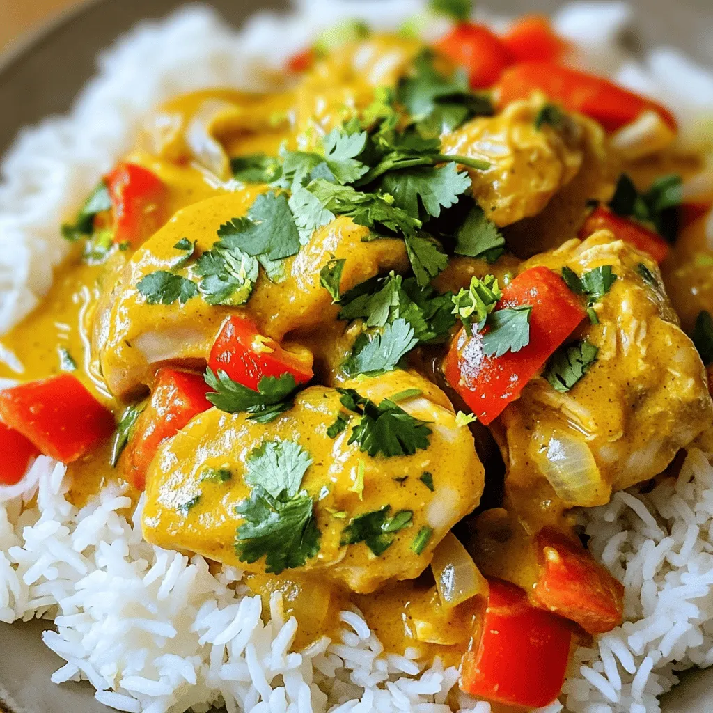 - Chicken: 2 lbs boneless, skinless chicken thighs - Coconut Milk: 1 can (13.5 oz) - Chicken Broth: 1 cup - Red Curry Paste: 2 tablespoons - Fresh Ginger: 1 tablespoon grated - Garlic: 4 cloves minced - Bell Pepper: 1 (red or yellow) sliced - Onion: 1 medium diced - Fresh Cilantro for garnish - Lime Juice: 2 tablespoons - Lime Zest: of 1 lime - Optional: Fish Sauce, Brown Sugar, Salt and Pepper The ingredients for Slow Cooker Coconut Lime Chicken Curry are simple yet full of flavor. First, the chicken thighs are key. They stay juicy and tender during cooking. Next, the coconut milk adds creaminess. It balances the heat from the red curry paste. I love using fresh ginger and minced garlic. They boost the flavor and aroma. For the veggies, I usually go for bell peppers and onions. They add color and sweetness. Fresh cilantro is a must for garnish. It brightens the dish at the end. Don’t forget the lime juice and zest! They give that zesty kick. If you want extra depth, add fish sauce and brown sugar. Salt and pepper round out the flavors. With these ingredients, you are ready to create a delightful meal. To start, gather your ingredients. In a large bowl, combine the coconut milk, chicken broth, and red curry paste. Next, add the grated ginger, minced garlic, lime juice, lime zest, fish sauce, and brown sugar. Whisk everything well until it blends perfectly. This mix forms the tasty base of your curry. Now, take your diced chicken thighs. Place them at the bottom of the slow cooker. Pour the coconut milk mixture evenly over the chicken. This helps the chicken soak up all the great flavors. It's time to add some color. Scatter the sliced bell pepper and diced onion on top of the chicken. Make sure all the veggies are submerged in the liquid. This step ensures they cook evenly and become tender. Cover your slow cooker and set it to low heat. Cook for 6 to 8 hours. If you’re short on time, set it to high heat for 3 to 4 hours. Either way, the chicken will become tender and juicy. Once your time is up, taste the curry. Check for seasoning. You might want to add salt, pepper, or more lime juice for extra zing. Adjust to your liking. Serve this delicious coconut lime chicken curry over fluffy jasmine rice. For a bright touch, garnish with fresh cilantro. Enjoy the amazing flavors and aromas! To make your curry just right, you can adjust the spice levels. Start with the red curry paste. If you want more heat, add a bit more. If you prefer less spice, use half the amount. You can also add a pinch of cayenne or chili flakes for extra kick. To boost the coconut flavor, try adding a splash of coconut cream. This will make your dish richer. You can also garnish with toasted coconut flakes for added texture and taste. If you do not have chicken thighs, you can use chicken breast. It cooks faster but may be less juicy. For a plant-based option, try using firm tofu or chickpeas. They absorb flavors well. For curry paste, you can use green curry paste if you want a different taste. If you don’t have curry paste, mix curry powder with some coconut milk. This will give you a nice base flavor. When using a slow cooker, cooking on low takes 6-8 hours. If you use high heat, it takes 3-4 hours. If you want to cook on the stove, simmer for about 30-45 minutes until the chicken is tender. If you need to adjust for larger servings, just add more chicken and increase the liquid. For smaller servings, cut the recipe in half. Keep the same cooking times for best results. {{image_2}} You can easily swap chicken thighs for chicken breasts. Chicken breasts are leaner but still tasty. Just be careful not to overcook them. If you want a seafood twist, try shrimp. Cook shrimp for the last 30 minutes, so they stay tender. For a plant-based option, use tofu. Press and cube firm tofu for the best texture. Adding more veggies makes the curry colorful and healthy. Carrots add sweetness, while snap peas bring crunch. Chop carrots into thin rounds for even cooking. Snap peas can go in during the last hour of cooking. This way, they stay crisp and bright. Always put hard veggies in first, and soft ones later. Change the taste by using different curry pastes. Green curry paste is spicier, while yellow curry paste is milder. You can also add fruits for a sweet kick. Pineapple chunks mix well with the curry. They add a juicy, tropical flavor that brightens the dish. To store leftovers, let the curry cool. Then, transfer it to an airtight container. Make sure it is sealed well. Store it in the fridge for up to four days. This keeps the flavors fresh and the chicken juicy. You can freeze chicken curry for longer storage. Use a freezer-safe container or bags. Make sure to leave space for expansion. It can last in the freezer for up to three months. When reheating, thaw it overnight in the fridge. Heat on the stove or in the microwave. Add a splash of chicken broth for moistness and flavor. This curry pairs well with naan bread or a fresh salad. You can also serve it with quinoa for a healthy twist. For garnishes, store fresh cilantro in a damp paper towel in the fridge. This keeps it fresh for longer. It takes about 6 to 8 hours on low heat. If you choose high heat, it will take about 3 to 4 hours. The chicken should be tender and cooked through when done. This slow cooking allows the flavors to blend well and makes the meat juicy. Yes, you can use frozen chicken. Just make sure to cook it on the high setting. This will help the chicken cook evenly and safely. Keep an eye on the cooking time. It may take a bit longer than fresh chicken. This curry is best served over fluffy jasmine rice. The rice absorbs the tasty sauce. You can also add naan bread for a fun twist. Fresh greens or a simple salad work great as a side too. Coconut milk adds a creamy texture and rich flavor. If you need a substitute, try using almond milk or cashew cream. You can also mix regular milk with a bit of coconut extract for a similar taste. However, the fl