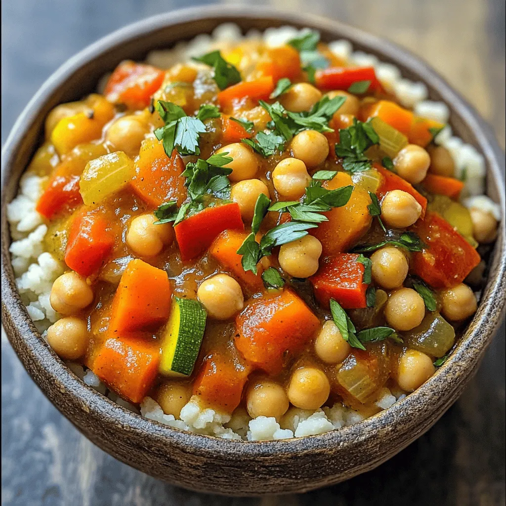Yes, you can make this stew on the stovetop. Start by heating olive oil in a large pot over medium heat. Sauté the onions for about five minutes until they look clear. Then add garlic, carrots, and bell pepper. Cook this mix for three to four minutes until soft. Next, add all the other ingredients, including chickpeas, diced tomatoes, broth, and spices. Bring this to a boil, then lower the heat. Let it simmer for about 30 to 40 minutes. Stir often and check the flavor.