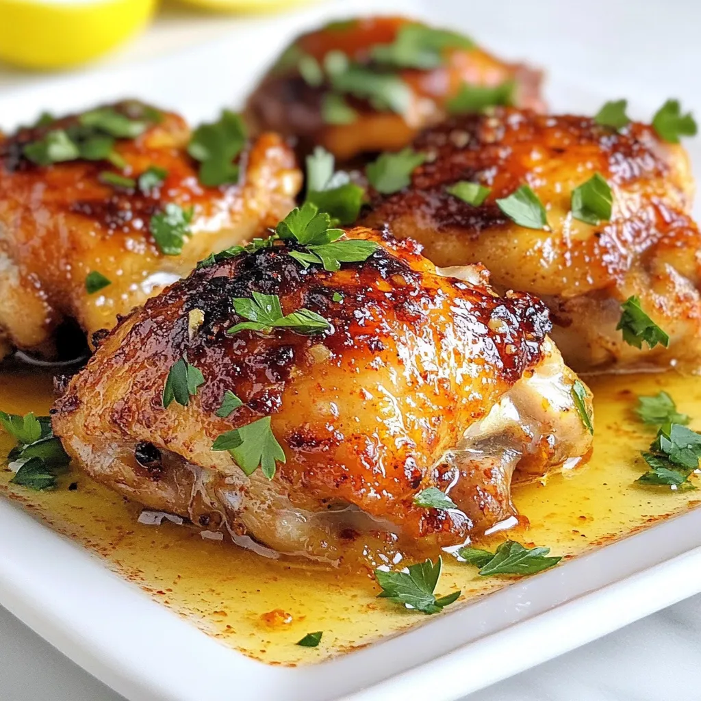 - 4 bone-in, skin-on chicken thighs - 2 tablespoons smoked paprika - 1 teaspoon garlic powder - 1 teaspoon onion powder - 1 teaspoon dried oregano - 1/2 teaspoon cayenne pepper (adjust for heat preference) - 2 tablespoons olive oil - Salt and black pepper to taste - 1 lemon, juiced - Fresh parsley, chopped (for garnish) - 1 cup chicken stock Using fresh ingredients makes your smoky paprika chicken thighs taste great. Fresh chicken ensures tenderness and juiciness. Fresh spices boost flavor and aroma. A ripe lemon adds a bright zing. Fresh parsley gives a pop of color and freshness. Always choose good quality items for the best results. If you lack smoked paprika, try regular paprika with a touch of cumin. Garlic powder can be swapped for fresh minced garlic. Dried oregano works well, but you can use Italian seasoning as a mix. If you prefer a milder dish, skip the cayenne pepper or use sweet paprika instead. For a different base, chicken broth can replace chicken stock. These swaps keep your dish tasty and fun! {{ingredient_image_1}} 1. Preheat your oven to 400°F (200°C). 2. Pat the chicken thighs dry with paper towels. This helps make the skin crispy. 3. In a small bowl, mix the smoked paprika, garlic powder, onion powder, dried oregano, cayenne pepper, salt, and black pepper. 4. Rub this spice mix evenly over both sides of the chicken thighs. Make sure to cover them well. 1. Heat olive oil in a large oven-safe skillet over medium-high heat. 2. Add the chicken thighs skin-side down. Sear them for 5-7 minutes. You want the skin to be crispy and golden brown. 3. Flip the chicken thighs over. Squeeze fresh lemon juice on top. 4. Pour the chicken stock around the thighs in the skillet. Avoid pouring it directly on the skin to keep it crispy. 5. Move the skillet to the oven and bake for 25-30 minutes. 1. Use a meat thermometer to check the chicken’s internal temperature. It should reach 165°F (75°C). 2. If you want extra crispy skin, broil the chicken for 2-3 minutes at the end. 3. Once done, take it out of the oven and let the chicken rest for 5 minutes before serving. 4. Garnish with freshly chopped parsley for a touch of color. To get that perfect crispy skin, start by drying the chicken. Use paper towels to pat the skin until it is dry. Moisture makes the skin soggy. Next, make sure to season well. Rub the spice mix all over the thighs, focusing on the skin side. When you sear the chicken, heat the oil until it shimmers. This helps create a nice golden-brown crust. If you want extra crispiness, broil the chicken for a few minutes at the end. Marinating adds depth to the chicken’s taste. Use a mix of smoked paprika, garlic powder, lemon juice, and olive oil. You can marinate the chicken for at least 30 minutes or up to overnight in the fridge. This allows the flavors to soak in deeply. If you want a kick, add a bit more cayenne pepper to the marinade. Always remember to bring the chicken to room temperature before cooking for even cooking. Pair your smoky paprika chicken thighs with sides that balance the flavors. Roasted vegetables like carrots, bell peppers, and zucchini work well. A simple green salad with a lemon vinaigrette adds freshness. You could also serve it with rice or quinoa for heartiness. If you want something more filling, try creamy mashed potatoes. Always garnish with fresh parsley for a pop of color and flavor. Pro Tips Choose Quality Chicken: Opt for organic or free-range chicken thighs for better flavor and texture. Let it Rest: Allow the chicken to rest after cooking to retain its juices for a more succulent bite. Customize Spices: Feel free to adjust the spices according to your preference; try adding cumin or smoked salt for a unique twist. Use a Meat Thermometer: Ensure perfect doneness by checking the internal temperature; it should reach 165°F (75°C). {{image_2}} You can change the flavor of your smoky paprika chicken thighs with different spice mixes. Try using cumin, coriander, and chili powder for a more Mexican twist. A mix of rosemary, thyme, and lemon zest can give a fresh herbal taste. The key is to use spices that you enjoy. Experiment with what you have at home. Grilling your chicken thighs adds a lovely smoky flavor. It also gives you those nice grill marks. To grill, start by marinating the chicken in the spices for a few hours. Preheat your grill to medium heat and cook for 6-8 minutes on each side. Baking is great for an easy, hands-off approach. In the oven, the skin gets crispy while the meat stays juicy. Both methods yield delicious results. Boneless thighs cook faster and can be very juicy. They also absorb flavors well. If you use chicken breasts, keep an eye on the cooking time. Breasts can dry out quickly. For boneless thighs, reduce the bake time to about 20-25 minutes. This keeps them tender and flavorful. Always check the temperature to ensure they reach 165°F (75°C). After cooking your smoky paprika chicken thighs, let them cool down. Place them in an airtight container. This keeps them fresh and safe. You can store them in the fridge for up to three days. If you want to keep them longer, freeze them. Wrap each thigh in plastic wrap, then place them in a freezer bag. This helps avoid freezer burn. They can last in the freezer for up to three months. To reheat chicken thighs, use the oven. Preheat it to 350°F (175°C). Place the thighs on a baking tray. Cover them with foil to keep them moist. Heat for about 15-20 minutes, or until they reach 165°F (75°C). You can also use the microwave. Place the thighs on a microwave-safe plate. Cover with a damp paper towel and heat for 1-2 minutes. Check the temperature before serving. Prepared chicken thighs have a good shelf life. In the fridge, they stay safe for three days. After that, they may lose quality and flavor. If frozen, they last for three months. However, for the best taste, eat them within one month. Always check for signs of spoilage like off smells or changes in color b