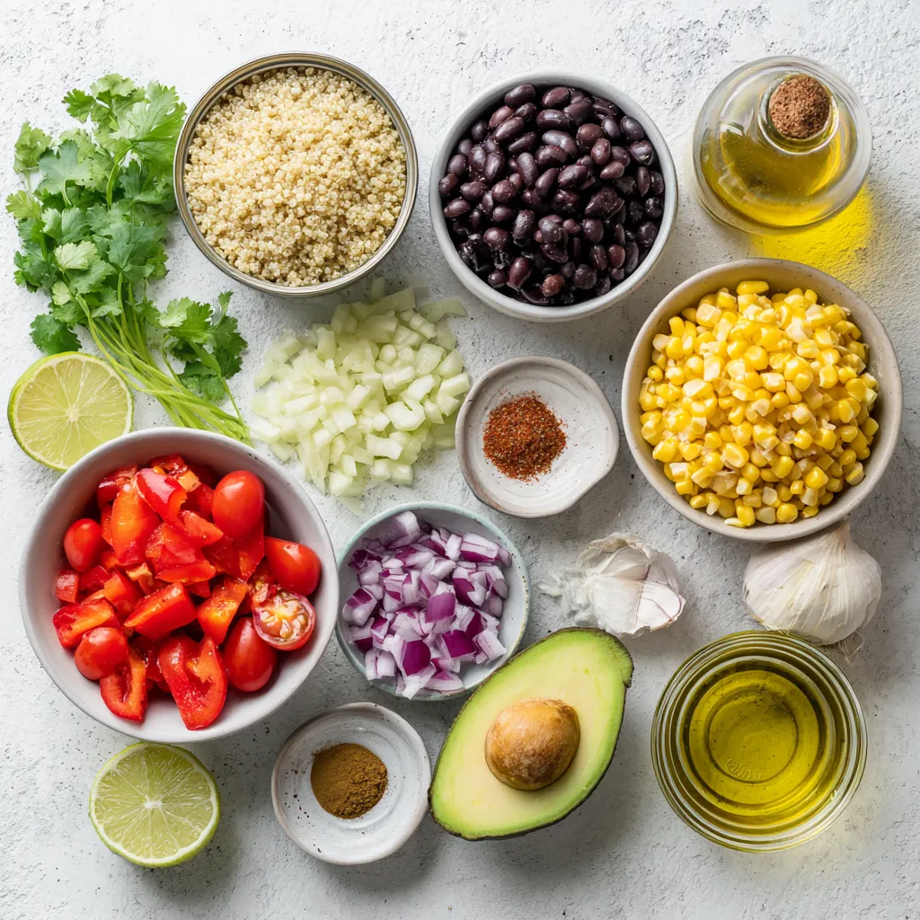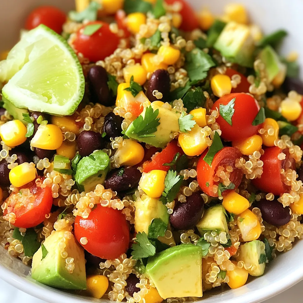 - 1 cup quinoa, rinsed - 2 cups vegetable broth - 1 can black beans, rinsed and drained - 1 cup cherry tomatoes, halved - 1 red bell pepper, diced - 1 small red onion, finely chopped - 1 cup corn (fresh, frozen, or canned) - 1 avocado, diced - 1 lime, juiced - 3 tablespoons olive oil - 1 teaspoon cumin - 1 teaspoon chili powder - Salt and pepper to taste - Fresh cilantro, chopped (for garnish) Rinsing quinoa is key. It removes saponins, which can make it bitter. Rinse it well in cold water. Use a fine mesh strainer for best results. Choosing vegetable broth matters too. A good broth adds flavor. Look for low-sodium options to control salt. Prepare your vegetables for the best texture. Dice and chop uniformly. This ensures even cooking and a nice bite in every forkful. {{ingredient_image_1}} To cook the quinoa, start by rinsing one cup of quinoa. Rinsing removes bitter flavors. Next, in a medium pot, mix the rinsed quinoa with two cups of vegetable broth. Bring this to a boil over medium heat. Once it boils, lower the heat. Cover the pot and let it simmer for about 15 minutes. After 15 minutes, check if the quinoa is done. It should be fluffy and have absorbed all the liquid. If it’s still wet, cover and simmer for a few more minutes. Once cooked, remove it from heat and let it cool. In a large mixing bowl, gather your veggies. Add one can of rinsed black beans, one cup of halved cherry tomatoes, one diced red bell pepper, and one finely chopped small red onion. Don’t forget one cup of corn, either fresh, frozen, or canned. Finally, add one diced avocado. Once the quinoa has cooled, add it to this bowl. To mix well, use a large spoon. Gently toss the ingredients together. This helps to distribute the flavors evenly throughout the salad. For the dressing, start with a small bowl. Whisk together the juice from one lime, three tablespoons of olive oil, one teaspoon of cumin, and one teaspoon of chili powder. Add salt and pepper to taste. To emulsify, whisk until the dressing looks smooth and combined. If you prefer it tangier, add more lime juice. For a richer taste, increase the olive oil. Adjust as needed to match your taste. Once ready, pour the dressing over the salad. Toss the salad gently to coat all the ingredients. Let it sit for at least 15 minutes. This allows the flavors to blend beautifully. Want to spice up your Southwest Quinoa Salad? Try adding jalapeños or a splash of hot sauce. This adds heat and excitement to each bite. If you prefer a milder option, skip the heat. You can also include cheese or nuts for extra flavor. Crumbled feta or cotija cheese brings creaminess. Chopped nuts like almonds or walnuts add crunch. Both options deepen the taste and texture. Serve your salad in a large, colorful bowl. This makes it eye-catching and fun. Garnish with chopped cilantro for a fresh touch. Add lime wedges on the side. They brighten the dish and invite guests to add more zing. Choose serving dishes that highlight the vibrant colors. Clear glass bowls work well, letting the salad shine. You can also use rustic wooden bowls for a cozy feel. To save time, prepare quinoa and vegetables in advance. Cook the quinoa a day ahead and store it in the fridge. Chop your vegetables earlier in the week. This keeps them fresh and ready to go. When storing salad, use airtight containers. This helps keep the salad crisp and tasty. If you plan to enjoy leftovers, store the dressing separately. Add it just before serving to maintain freshness. Pro Tips Rinse Quinoa Thoroughly: Always rinse quinoa under cold water before cooking to remove its natural coating, called saponin, which can give it a bitter taste. Use Fresh Lime Juice: For the best flavor, use freshly squeezed lime juice instead of bottled. It brightens up the salad and enhances the overall taste. Chill Before Serving: Allow the salad to sit in the fridge for at least 15 minutes after mixing to let the flavors meld together for a more delicious experience. Customize Your Veggies: Feel free to swap or add additional vegetables based on your preference or seasonality, such as cucumbers, radishes, or bell peppers of different colors. {{image_2}} You can switch up the beans in this salad. Try pinto beans or kidney beans for a new taste. If you want more veggies, add zucchini or bell peppers. You can use chickpeas for a protein boost. If you need gluten-free options, quinoa is already safe. You can also add nuts or seeds for extra protein and crunch. Instead of lime juice, use lemon or orange juice for a fresh twist. You can try apple cider vinegar for a zing. For a creamy dressing, mix in Greek yogurt or sour cream. Add a touch of chipotle for a smoky flavor. Each dressing choice will change the taste of your salad. This salad pairs well with grilled chicken or shrimp. You can create a complete meal by adding protein. It also goes well with spicy dishes or tacos. Serve it as a side dish for a BBQ or picnic. The bright flavors will make your meal pop. To keep your Southwest Quinoa Salad fresh, use airtight containers. Glass or BPA-free plastic work best. These containers help keep moisture in and air out. If you store it well, your salad stays tasty for up to four days in the fridge. Refrigerate the salad right after serving. Let it cool before sealing the container. This helps maintain the crispness of the veggies. You can also separate the dressing from the salad if you prefer. This keeps the salad fresh longer. You can freeze the quinoa and veggies separately. First, let the quinoa cool completely. Then, put it in a freezer-safe bag or container. Do the same for the vegetables. They will keep well for about three months. When you’re ready to eat, thaw the quinoa and veggies overnight in the fridge. You can add them to a bowl and mix them with your favorite dressing. Reheat the quinoa gently in the microwave or on the stove. This makes it warm and fluffy again. Quinoa is a tiny seed that acts like a grain. It is packed with nutrients. 
