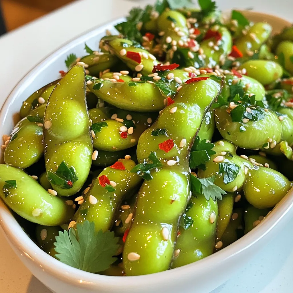Serve your spicy garlic edamame warm. It makes a great snack or side dish. You can add sesame seeds for crunch. Fresh cilantro brightens the flavor too. Try pairing it with rice or noodles for a full meal. This dish also goes well with drinks. Enjoy it at parties or cozy nights in!