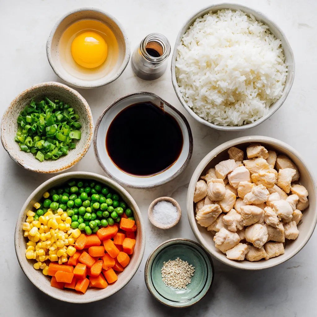 To make teriyaki chicken fried rice, gather these fresh ingredients. Using day-old rice works best. It’s drier and fries better. Diced chicken gives protein and adds flavor. Teriyaki sauce brings a sweet and savory taste. Mixed vegetables like peas, carrots, and corn add color and nutrition.