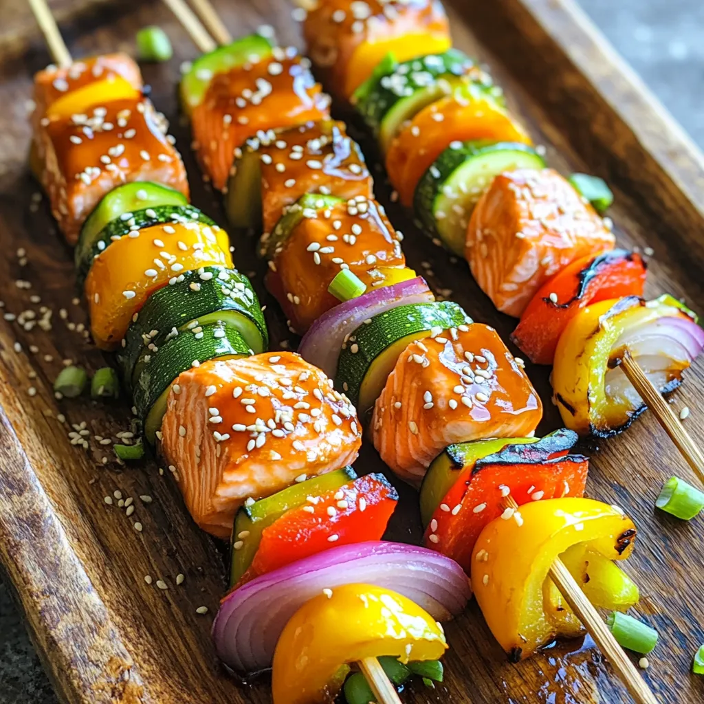 Presentation matters! After grilling, let the skewers rest for a minute. This keeps the salmon moist. Serve the skewers on a large platter. Sprinkle sesame seeds and chopped green onions on top for color. Pair them with steamed rice or a fresh salad for a complete meal. The vibrant colors of the bell peppers and zucchini make the dish eye-catching. Enjoy your beautiful creation!