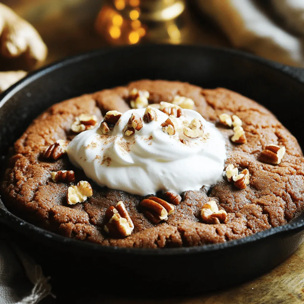 To make the warm gingerbread molasses skillet cookie, gather these key items: - 1 cup all-purpose flour - 1/2 teaspoon baking soda - 1 teaspoon ground ginger - 1 teaspoon ground cinnamon - 1/2 teaspoon ground nutmeg - 1/4 teaspoon ground cloves - 1/4 teaspoon salt - 1/2 cup unsalted butter, softened - 1/2 cup brown sugar, packed - 1/4 cup granulated sugar - 1/4 cup unsulfured molasses - 1 large egg - 1 teaspoon vanilla extract For a fun twist, you can add some extra ingredients: - 1/2 cup chopped pecans or walnuts - Whipped cream or vanilla ice cream for serving If you need to swap ingredients, here are some ideas: - Use whole wheat flour instead of all-purpose flour for a healthier option. - Substitute maple syrup for molasses if you want a different flavor. - Replace brown sugar with coconut sugar for a lower glycemic index. - Use a flax egg (1 tablespoon ground flaxseed + 3 tablespoons water) as an egg substitute for a vegan version. These swaps can help you create a tasty cookie while meeting your needs. Enjoy the process and feel free to get creative with your choices! First, preheat your oven to 350°F (175°C). This step is key for even baking. While the oven heats, take a 10-inch cast iron skillet. Grease it well with butter or cooking spray. This helps the cookie come out clean after baking. In a medium bowl, whisk together these dry ingredients: - 1 cup all-purpose flour - 1/2 teaspoon baking soda - 1 teaspoon ground ginger - 1 teaspoon ground cinnamon - 1/2 teaspoon ground nutmeg - 1/4 teaspoon ground cloves - 1/4 teaspoon salt Set this bowl aside. Now, in a larger bowl, beat together: - 1/2 cup unsalted butter, softened - 1/2 cup brown sugar, packed - 1/4 cup granulated sugar Use an electric mixer to blend these until creamy. This should take about 3 minutes. Next, add: - 1/4 cup unsulfured molasses - 1 large egg - 1 teaspoon vanilla extract Mix these in at low speed until combined. Gradually fold in the dry ingredients. If you like nuts, add in 1/2 cup chopped pecans or walnuts. Pour the dough into your greased skillet, spreading it out evenly. Place the skillet in your preheated oven. Bake for 20-25 minutes. Check that the center is firm and edges are golden. When done, let it cool for about 5 minutes. Serve warm, topped with whipped cream or vanilla ice cream. Enjoy your delicious warm gingerbread molasses skillet cookie! To make the best skillet cookie, start with room temperature butter. This helps to mix the sugars well. Use a cast iron skillet for even heat. Grease the skillet to prevent sticking. Make sure not to overmix your dough. Mix until just combined for a soft cookie. Bake until the edges are golden but the center is still soft. This gives you a chewy texture. One mistake is using cold butter. It won’t mix properly and affects the texture. Another is adding too much flour. Measure your flour correctly by scooping and leveling it off. Avoid baking for too long. Check the cookie a few minutes before the time is up. If you let it cool too long, it can harden. Lastly, don’t skip the spices. They add warmth and depth to your cookie. Ginger, cinnamon, nutmeg, and cloves make this cookie special. Each spice brings warmth and flavor. You can adjust the amounts to fit your taste. For a bolder flavor, add more ginger or cinnamon. If you love a little heat, a pinch of cayenne pepper works well. Experiment with spices to find your perfect blend. Adding chopped nuts can also enhance texture and flavor. {{image_2}} To make a nut-free version, simply leave out the chopped pecans or walnuts. This change keeps the cookie soft and delicious. You can also add a little extra flour to keep the texture just right. A nut-free cookie is great for those with allergies. It still tastes amazing without the nuts! To create a vegan version, swap the egg for a flax egg or applesauce. Use 1 tablespoon of ground flaxseed mixed with 3 tablespoons of water. Let it sit for five minutes to thicken. For the butter, use a vegan butter substitute. This will keep the rich flavor while making it plant-based. The molasses and spices will still shine through! Want to add more flavor? Consider mixing in some chocolate chips or dried fruit. Adding 1/2 cup of dark chocolate chips gives a sweet twist. For a fruity touch, add 1/2 cup of dried cranberries or raisins. You can also mix in citrus zest, like orange or lemon, for a fresh pop. These additions can elevate your skillet cookie and make it your own! To store your warm gingerbread molasses skillet cookie, let it cool down first. Once cool, cover the skillet with plastic wrap or aluminum foil. You can also transfer the cookie to an airtight container. This way, it keeps its moisture and flavor. Stored properly, it lasts for up to three days at room temperature. When you're ready to enjoy your cookie again, preheat your oven to 300°F (150°C). Place the skillet in the oven for about 10 minutes. You can also reheat individual slices in the microwave for about 20-30 seconds. Add a scoop of ice cream or whipped cream on top when serving! If you want to save some for later, freezing works well. Cut the cookie into slices and wrap each slice in plastic wrap. Then, place them in a freezer bag. Make sure to remove as much air as possible. They will stay good for up to three months. To thaw, leave them in the fridge overnight, or microwave for a quick treat. A skillet cookie is a large, baked cookie made in a skillet. It has a chewy center and crispy edges. This warm gingerbread molasses skillet cookie is a fun twist on the classic. You bake it right in a cast iron skillet, which gives it a lovely crust. You can serve it straight from the pan, making it a great dessert for sharing. You can tell the cookie is done when the center is set and the edges are slightly golden. If you gently press the top, it should bounce back. Use a toothpick to check; it should come out clean or with a few moist crumbs. Start checking around 20 minutes to avoid overbaking. Yes, y